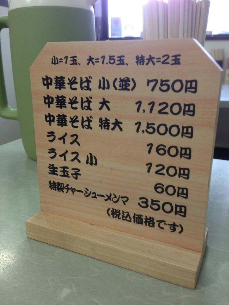 メニューは中華そば、ライス、生玉子、チャーシュー&メンマのみ。ラーメンは麺の量が選択できますが、小が普通の量(1玉)。大以上は結構な量かも。