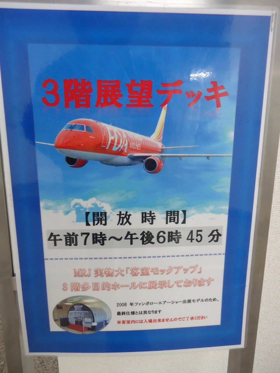 なお、展望デッキ手前の休憩室には発着便案内のディスプレイと地元三菱重工業で製造している国産旅客機MRJの機内実物大モックアップが展示されています。- 旅行時期
