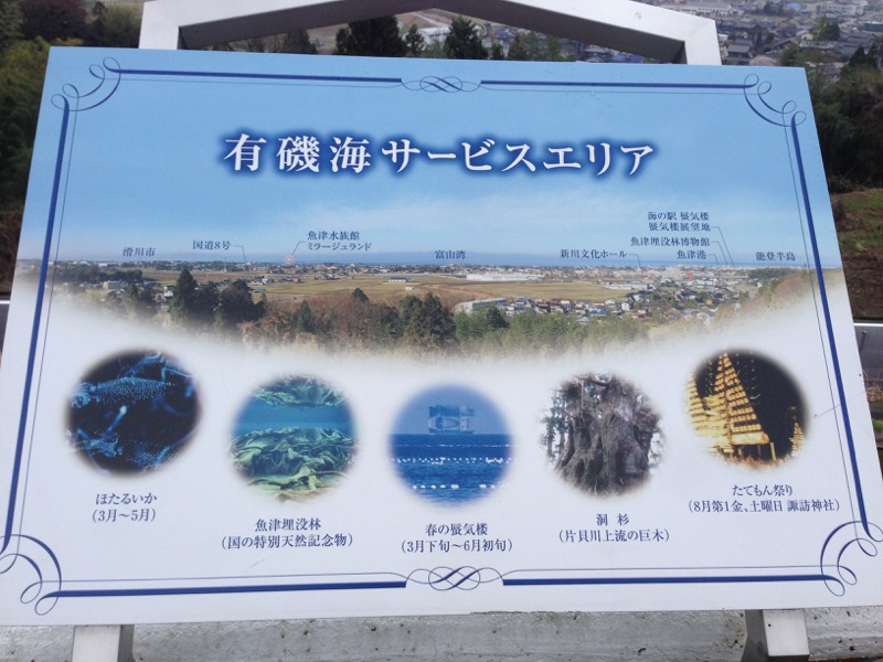 北陸道下り線のサービスエリア。上り線と下り線のサービスエリアは3キロ以上は離れています(ちなみに下り線は魚津市、上り線は滑川市に位置します)。ここを過ぎるとサービスエリアがしばらく無いので給油が必要な場合はここが最後。サービスエリアとしては普通の設備(トイレも1箇所)ですが、レストラン&スナックコーナーはホテルニューオータニ高岡の直営で味、サービスは本格的(白エビを使った丼ものや富山ブラックラーメン等もあり)。特に午前11時頃からホテルニューオータニ高岡で製造されたます寿司が限定品として入荷し、スナックコーナーでも味わう事が可能です(350円で2切れ)。