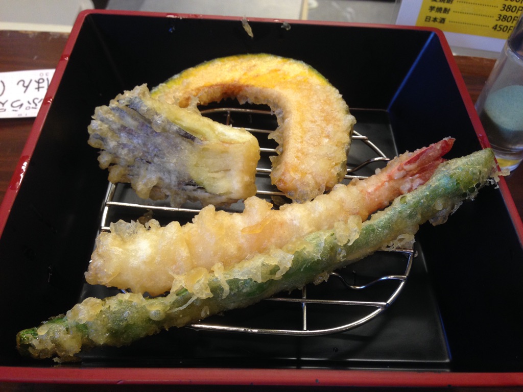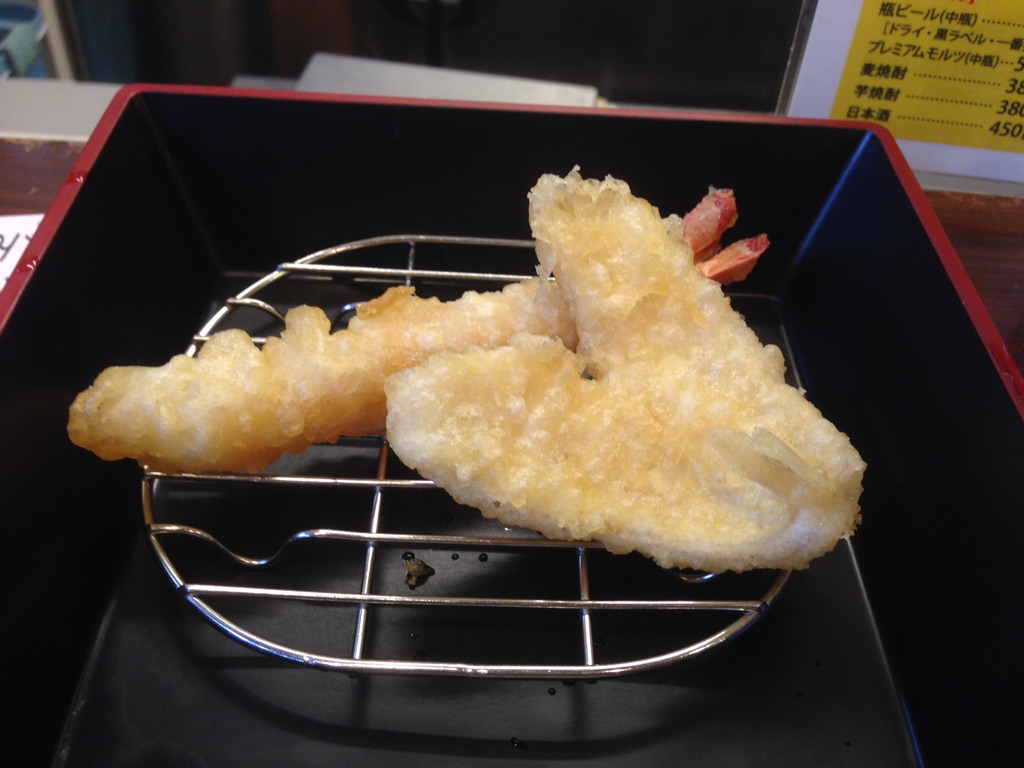 いろいろな盛り合わせがあるのですが、今回はえび、きす、野菜(3種)、白えびのかき揚げがセットになったベーシックな「天ぷら定食」を注文(ホタルイカの天ぷらがあるのですが、今回は注文せず)。盛り合わせのみでも注文できますが、定食(ごはん(小)・味噌汁付)との差は30円なので定食で頼んだほうがお得。ごはんは大、中、小が選べますが、七福特性塩辛(「特性」は間違いではない)、しば漬けが無料で食べ放題なので、男性は中以上の方がよいかも。ちなみに塩辛は持ち帰り用が販売されてます)。