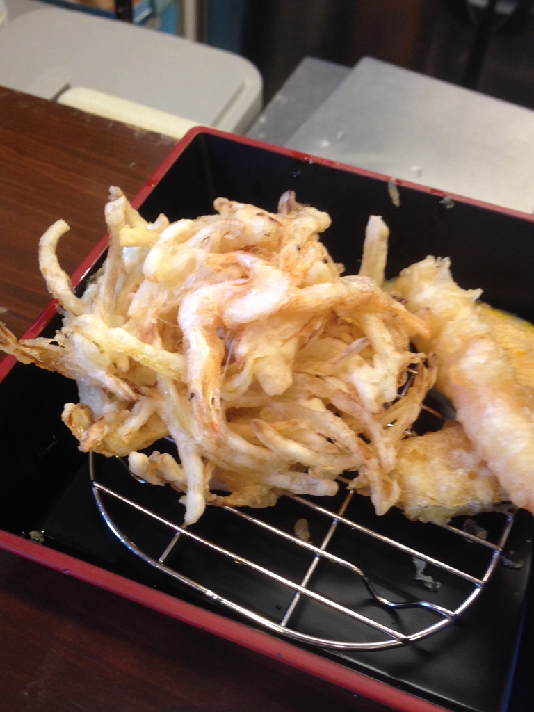 カウンター席の場合天ぷらは揚げたてを順に持ってきてくれます。最後に白えびのかき揚げが来たのですが、かき揚げ丼にして食べるのが「七福流」とのこと。とはいえ、塩辛がおいしいのでなかなかできないのですが。