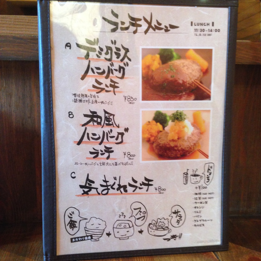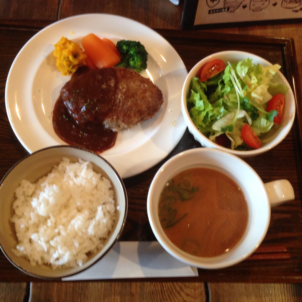ランチタイムはデミグラスハンバーグランチ、和風ハンバーグランチ(大根おろし)、気まぐれランチ(このメニューはハンバーグではない)の3種類。800円~850円でサラダ、スープと洒落たお茶碗に入ったごはんが付きます。ごはんはおかわり自由!