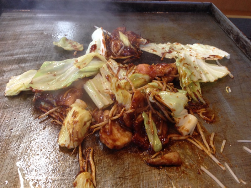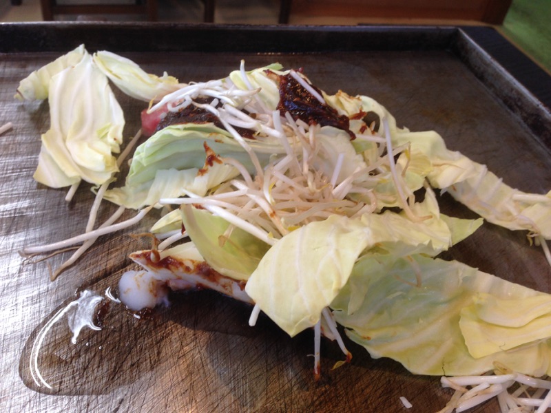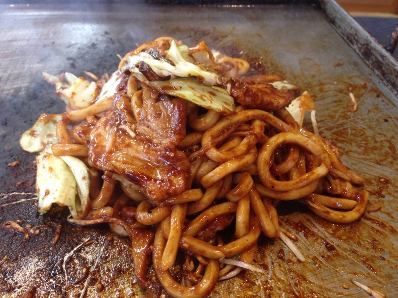 好きな肉を頼むと味噌と野菜(キャベツ、もやし等/肉代に含まれる)が運ばれてきて、鉄板に落とされます。店員の作業はここまで。後は自分で炒めます(フライ返しもトングもないので箸で炒めます)。肉と野菜に火が通ったらうどん(1玉100円)を投入。うどんと味噌が絡まったら出来上がり!火を落とさないと確実に焦げるので注意。