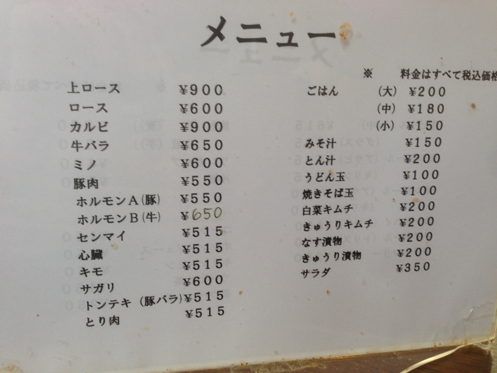 メニューは上ロース、ロース、カルビ、牛バラ、ミノ、豚肉...肝心な「みそ焼きうどん」が無い!