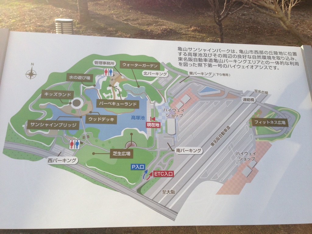東名阪道亀山パーキングエリアの上り線にある県営公園(ハイウェイオアシス)。下り線からも橋を渡って入る事ができ、一般道からも使える駐車場もあります(車が無い場合は亀山駅からシャープ方面行きのバスを利用)。