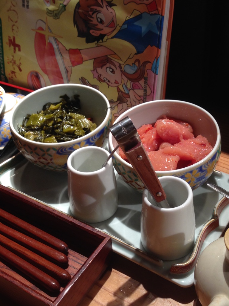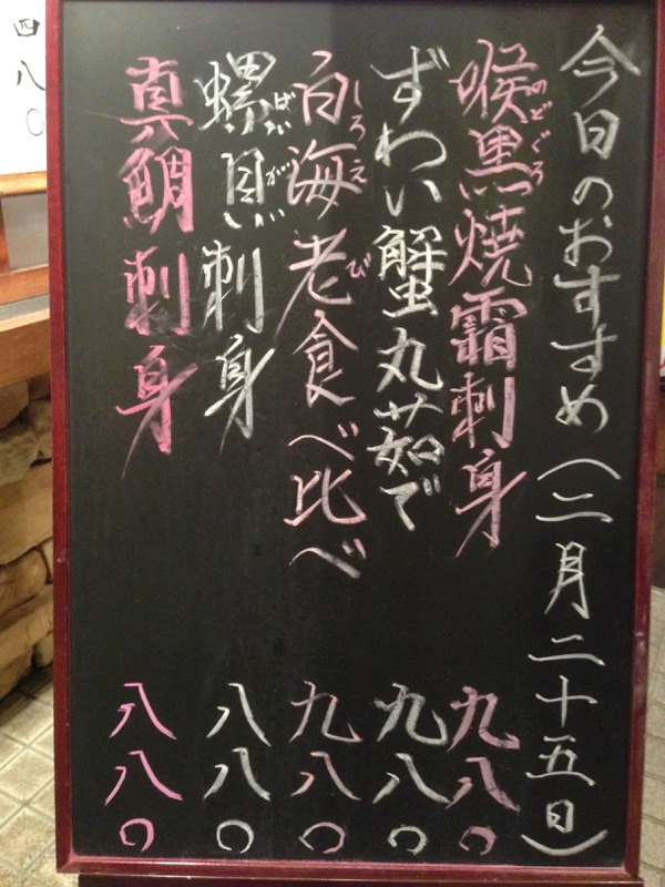 店の看板に「富山湾鮮魚」と書いてある通り、東京では見かけないメニューが豊富。個人的には幻魚(げんげ)の唐揚げがおすすめ。見た目は少々グロテスク(深海魚で鱗が無い)ですが、味はあっさり系(某「フィレ●フィッシュ」に似たような味かも)。また刺身の盛り合わせも富山湾で水揚げされたぶりが入っていて2名分で2,400円はおすすめ価格。