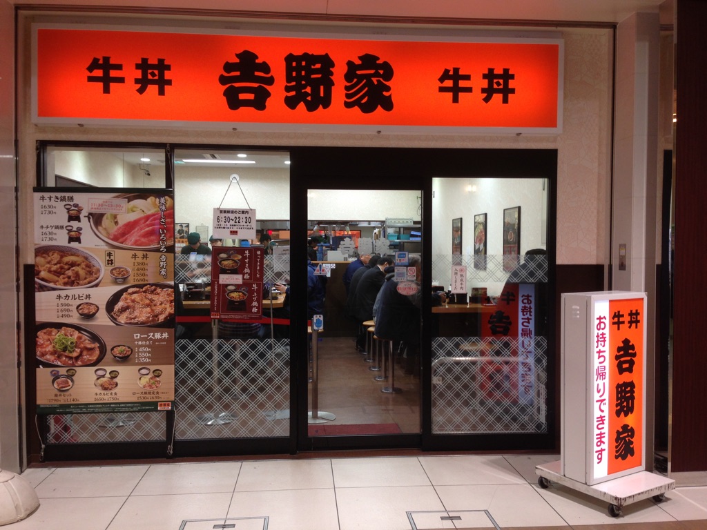 金沢駅構内にある吉野家。百番街のテナントなので百番街のポイントカードが利用可能です(支払時にWAON、ICOCA、Suica、PASMOの利用可能)