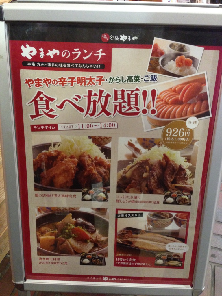 テーブルの上には「やまや」の明太子、高菜が置いてあってご飯とともに食べ放題!しかも土曜、日曜も全く同じランチメニューをやっているのが嬉しい(価格も同じ)。
