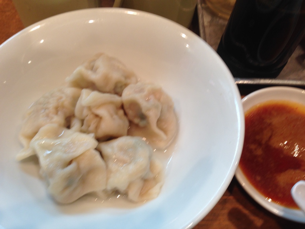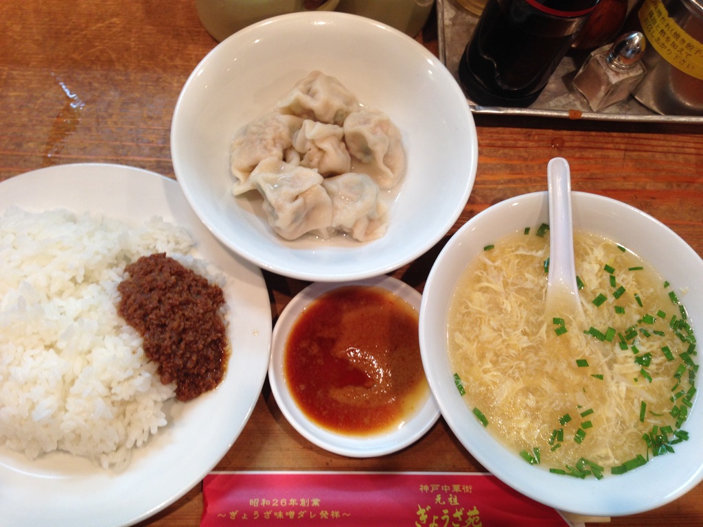餃子は神戸牛が隠し味。タレはここは秘伝の味噌ダレにお酢と醤油をまぜていただきます。水餃子も焼餃子にはニンニクが入ってなくあっさり系ですが味噌がうまくカバー(好みでタレにニンニクを入れることは可能)。