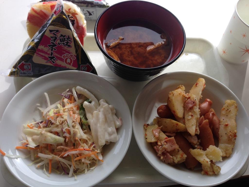 無料朝食があって、おにぎり、パンや味噌汁、サラダ類があります。ただし朝9時を過ぎると片付けられてしまうので早めが良いかも。