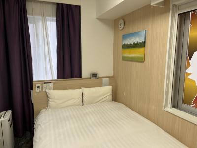 ダブルルームに宿泊(連泊)。ベッドはセミダブルに近い大きさ。お一人様には問題なし(二人は少々狭いかも)。部屋の入口前には扉があって閉めると静かになるのも嬉しい。ちなみに冷蔵庫にはミネラルウォーターと1泊目のみゼリー(おもてなしとのこと)が入っていた。