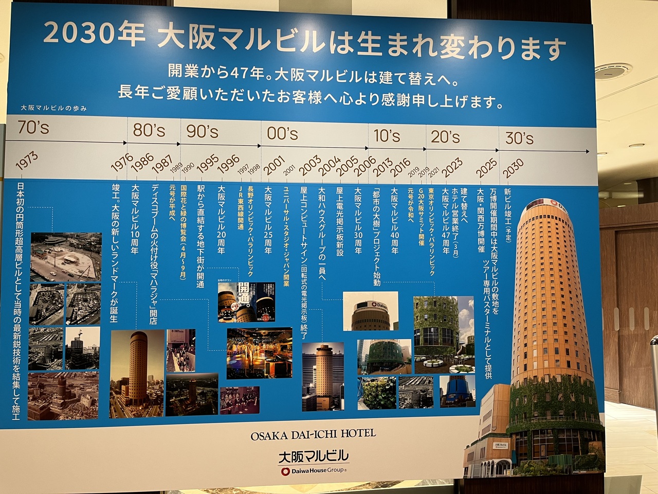残念ながら2023年夏頃から取り壊しになるそうで、丸いビルとはお別れ。一旦関西万博で利用するバス駐車場として利用された後に新しいビルが建てられるとのこと。新しいビルはまだまだ先だが、特徴的なビルの形を少しでも残したデザインになると良いなと思う。- 旅行時期