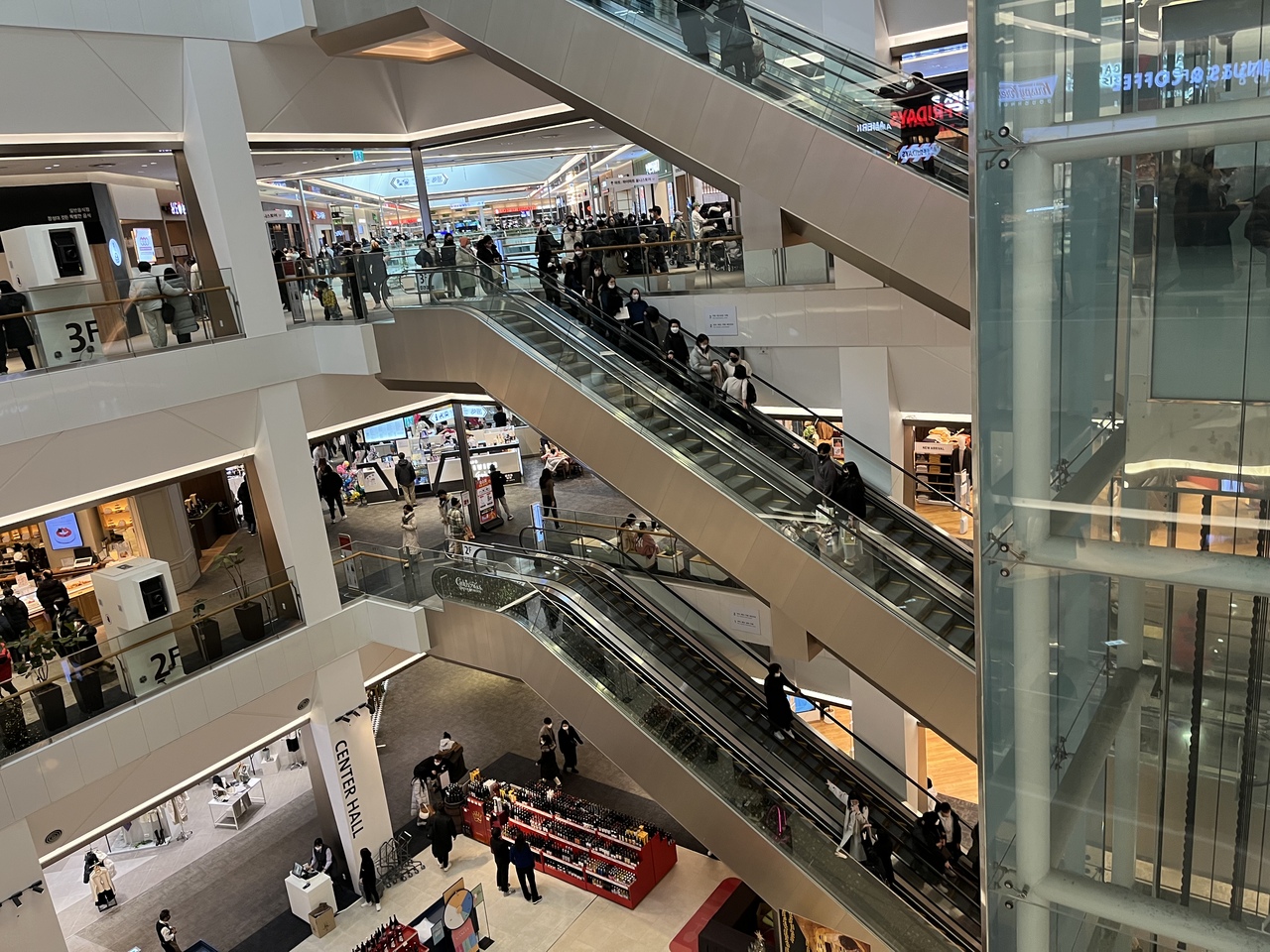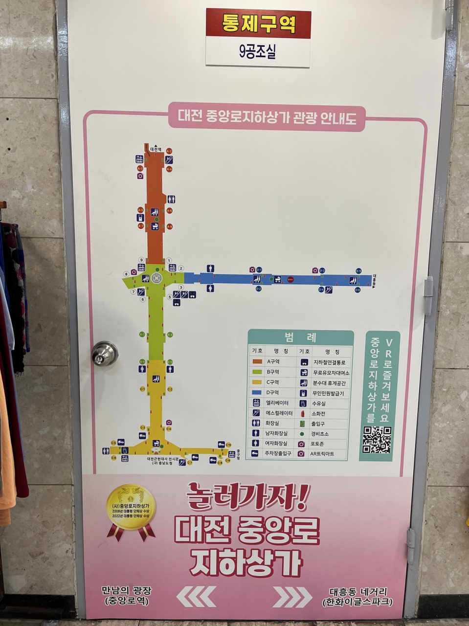 地下鉄駅、NC百貨店付近を中心とし、赤(A)、緑(B)、黄(C)、青(D)の4つのソーンに分かれている。通路は比較的広めでごちゃごちゃしていないので、比較的進みやすい。