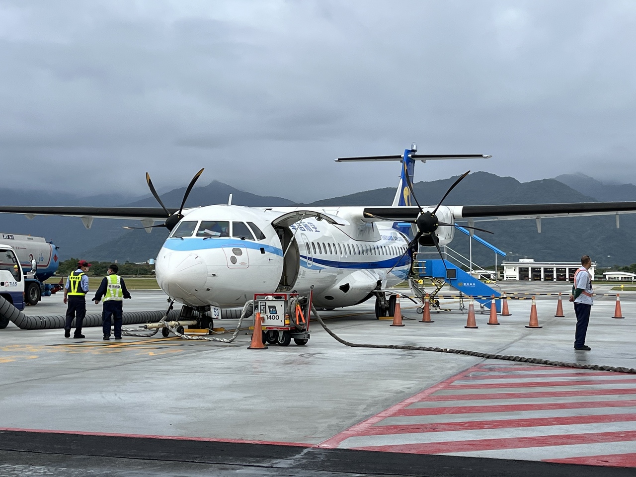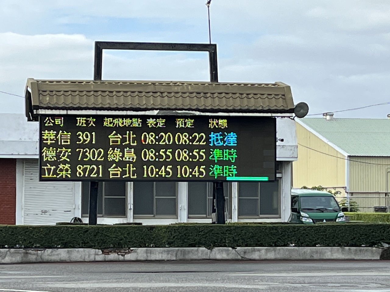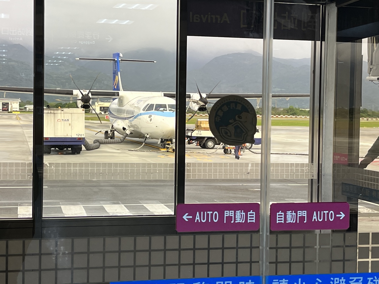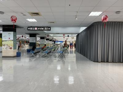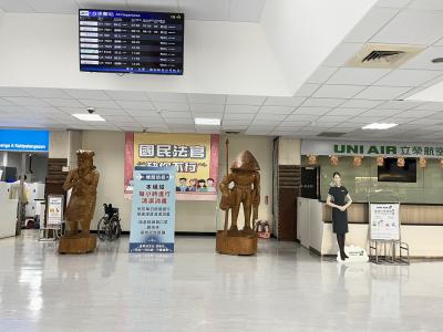 華信航空(マンダリン航空/チャイナエアラインの子会社)、立榮航空(ユニー航空/エバー航空の子会社)、徳安航空(デイリーエアー/離島路線)が就航。とは言え発着航空便はさほど多くなく、空港内はのーんびりとした雰囲気。到着案内板は屋外にもある。松山空港からの便で到着しましたが、乗客が下りた後、預入手荷物をトラックに積み込み、それがターンテーブルに運ばれる流れを見ることが出来る。