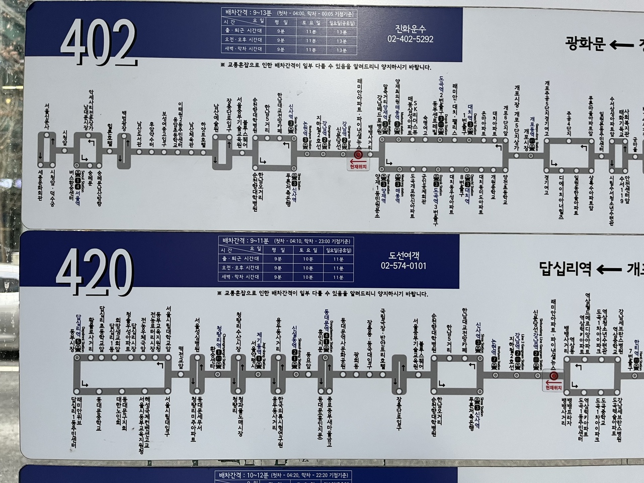 402番、420番共に漢南大橋を経由し江南と江北エリアを結ぶソウル市内の路線バス。