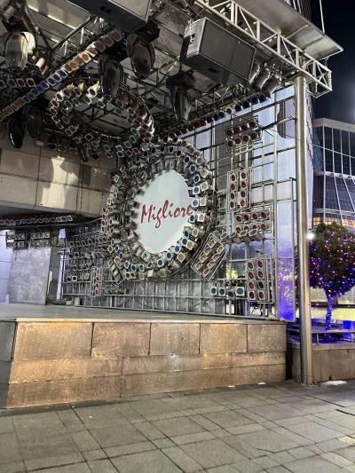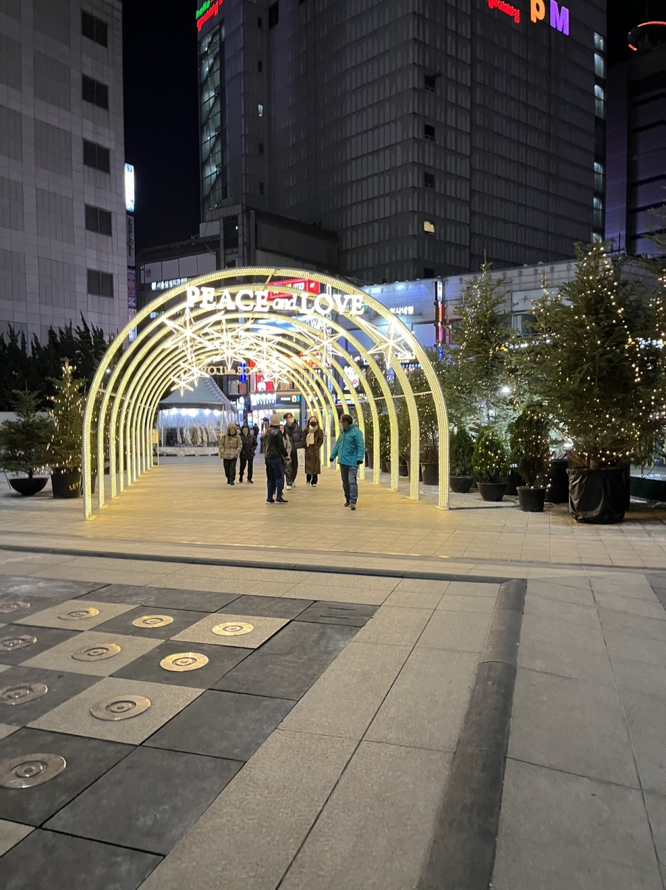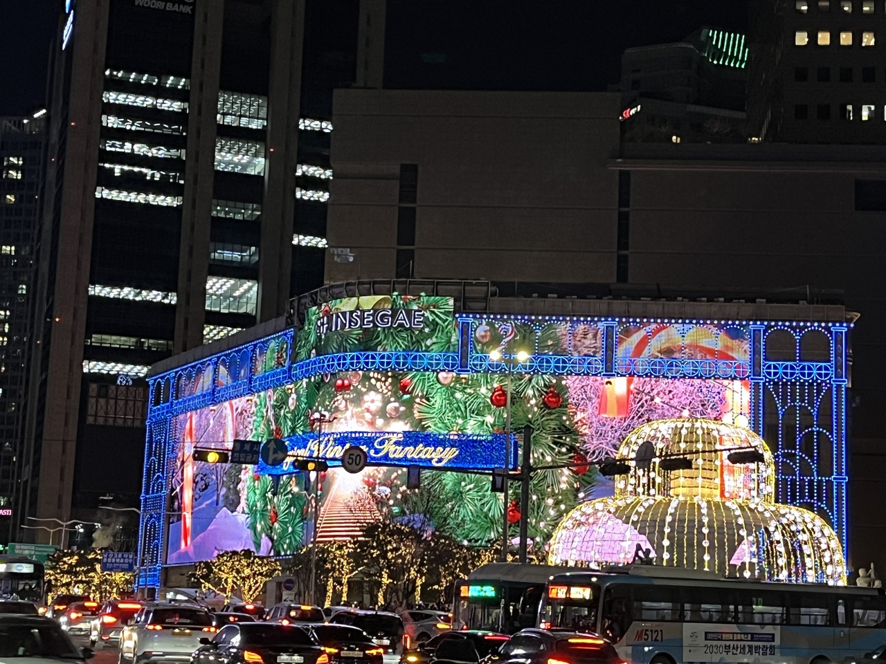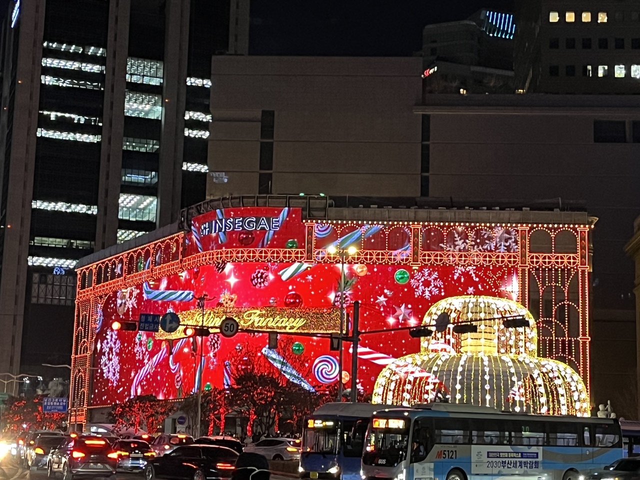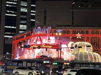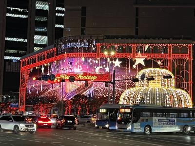 本館(昔三越京城店だった建物)を劇場に約3分間のプロジェクションマッピングが流れます。毎年の風物詩だそうで、幻想的なクリスマスシーンを楽しむ人たちで、百貨店向かいの郵便局や通りには多くの人が。