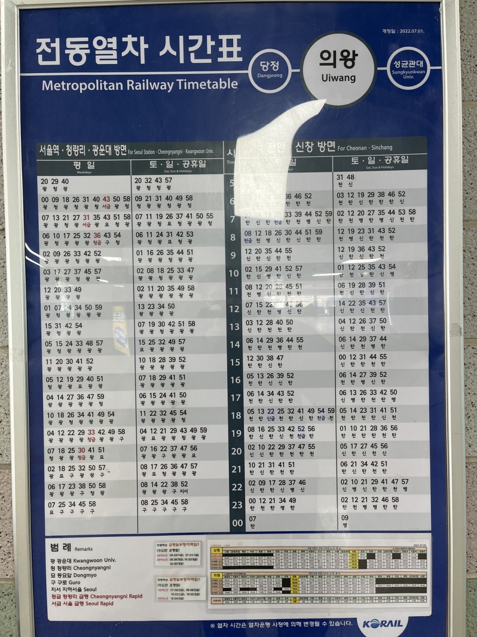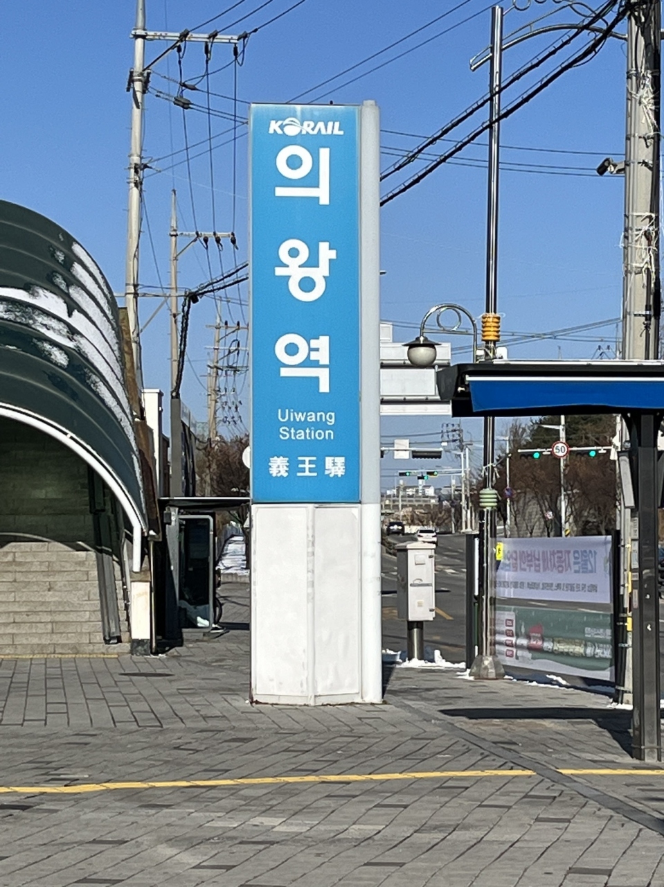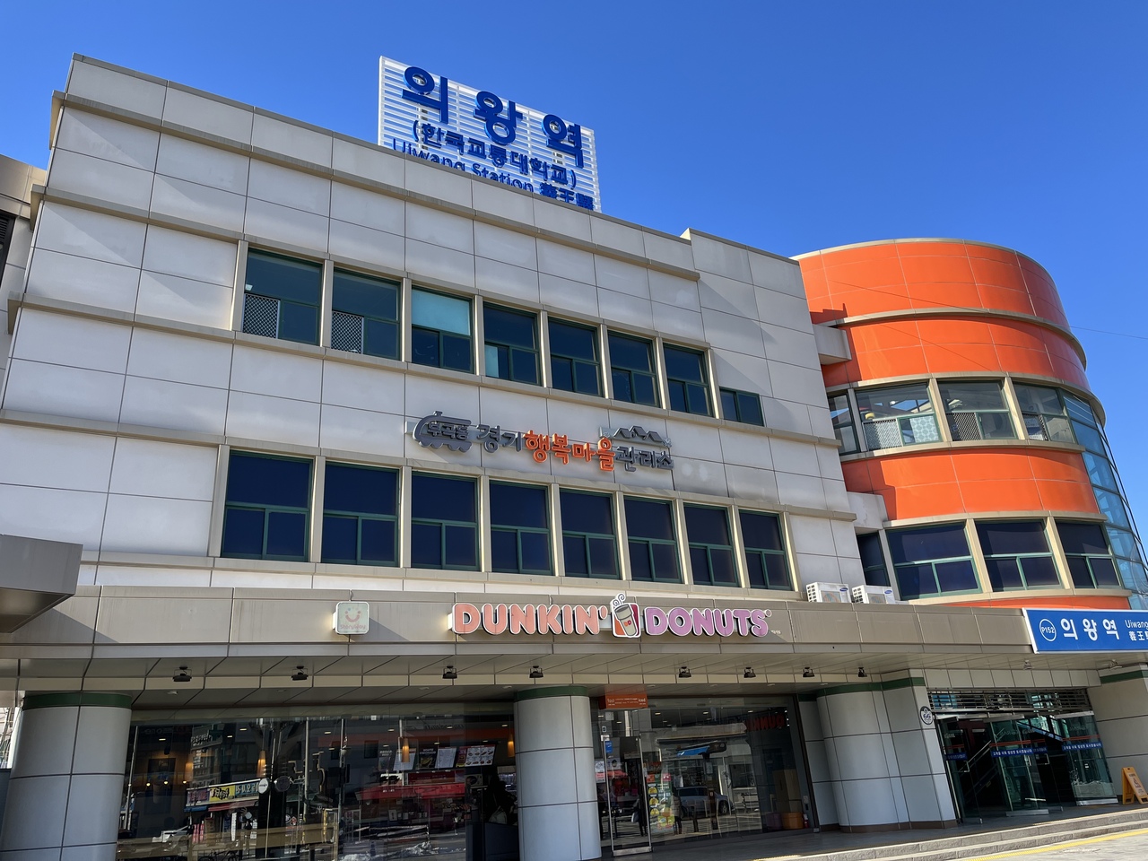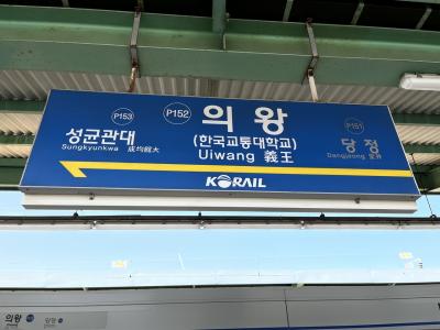 KORAIL(韓国鉄道公社)京義線の駅。京畿道義王市の玄関駅だそうで比較的立派な駅舎。鉄道博物館最寄の駅のせいなのか、駅前広場に行くエレベーターの横には踏切のオブジェが飾ってある。