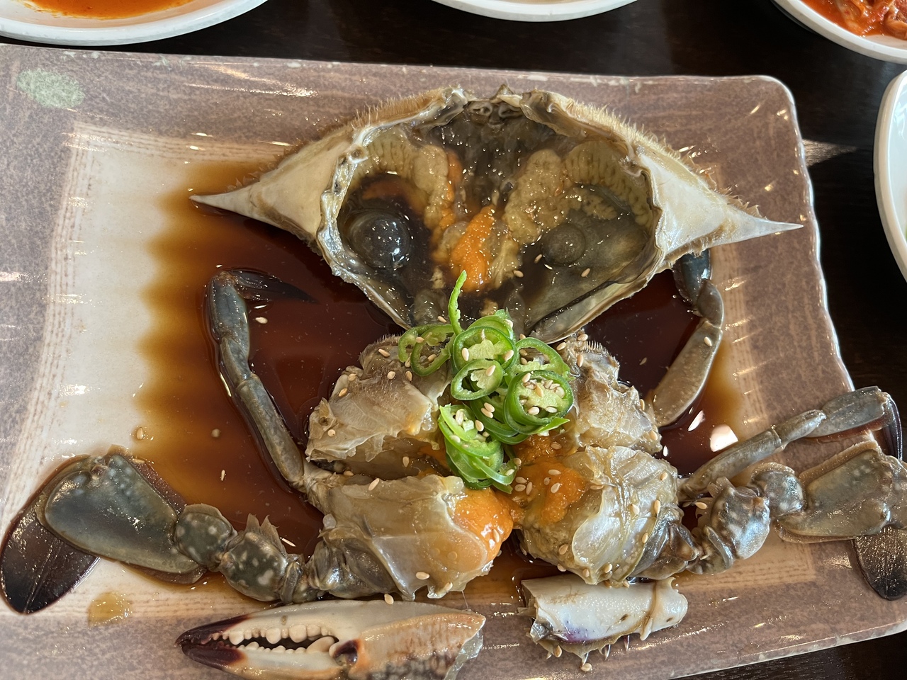 平日のランチタイムのため、15,000ウォンのランチメニュー(トゥッペキワタリガニ鍋)を食べている近隣(かな?)のサラリーマンが多いが、今回は奮発してカンジャンケジャン(ワタリ蟹の醤油漬け)の大を注文。価格は3年前より少し上がっているかな。