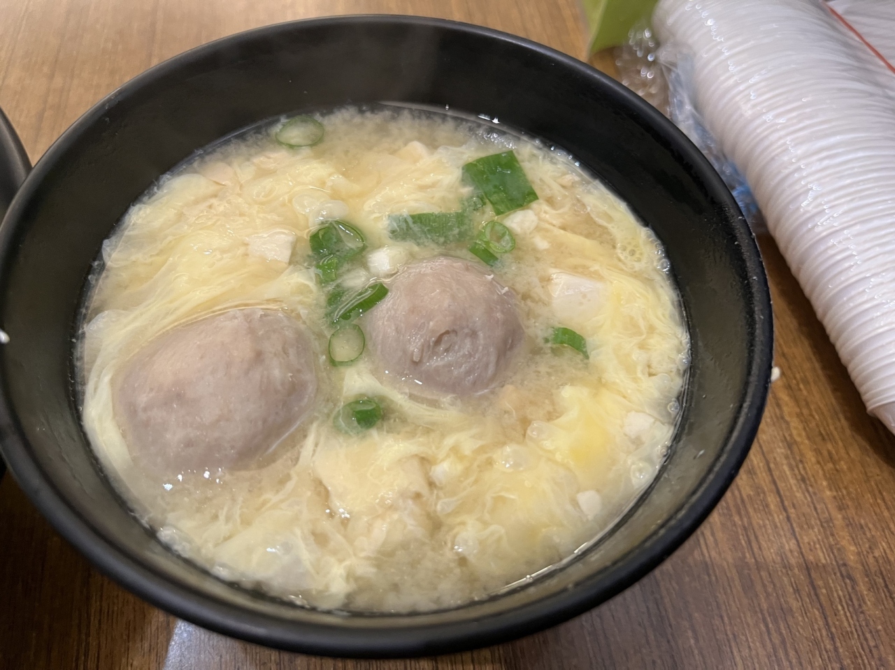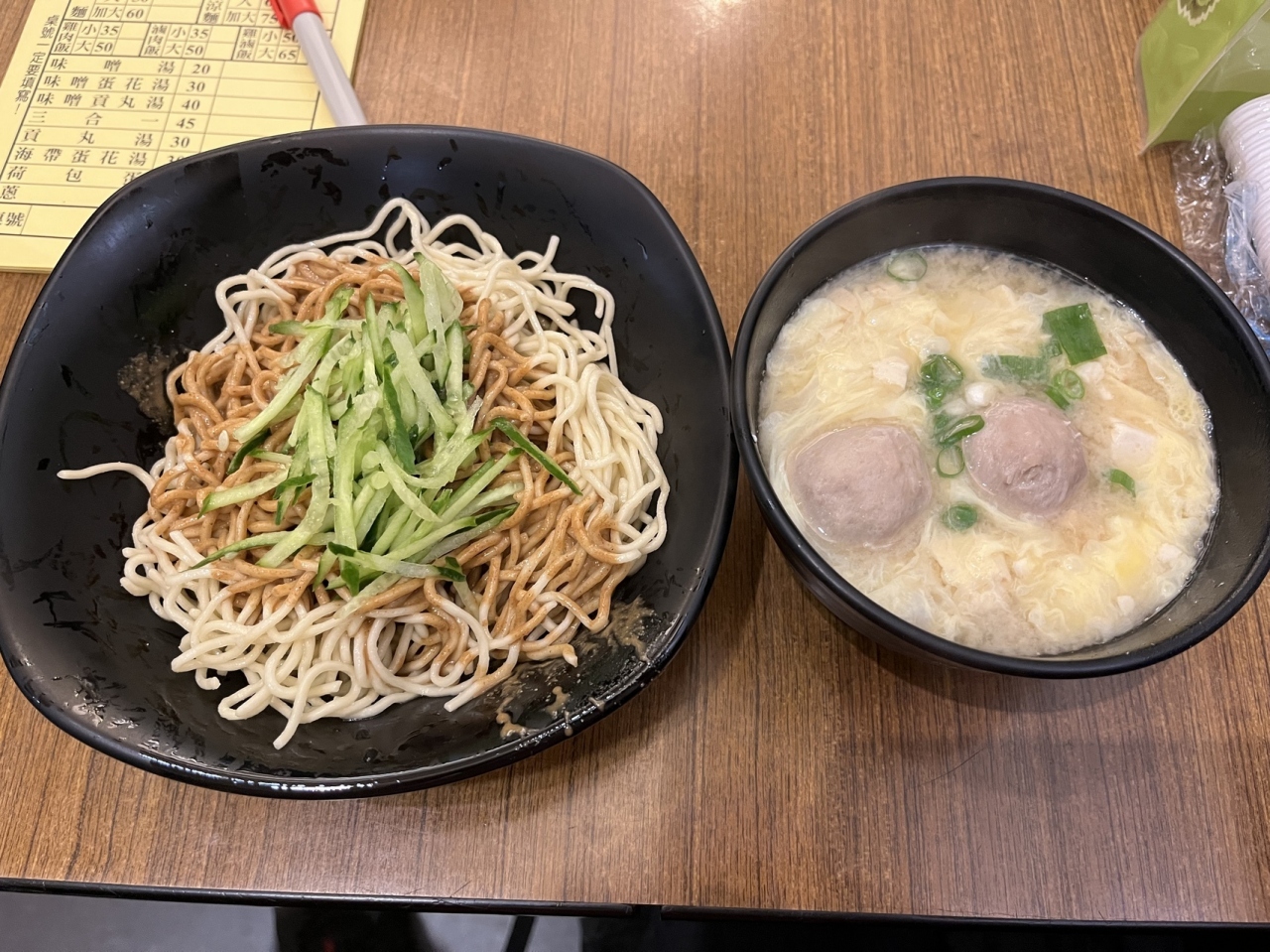 涼麺はニンニクが少し効いたゴマダレと胡瓜を混ぜながらいただく。一口すすると胡麻の旨みと香りが口の中に広がる、涼麺は台湾のコンビニでも定番商品だが、やはりお店で食べたほうが美味しい。また三合一は「味噌湯」(味噌汁)「蛋花湯」(たまごスープ)「貢丸湯」(つみれ汁)をミックスしたスープ(湯)。台北南京三民の涼麺店が発祥だそうなのだが、それぞれのスープ(湯)の良いところが混ざりあいこちらもおすすめ。- 旅行時期