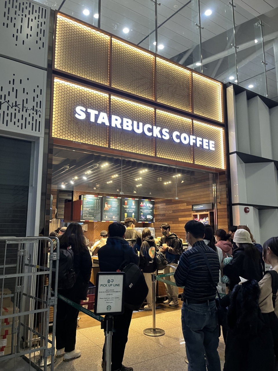 店構え、スタッフはコロナ禍前と変わっていないが、他の飲食店が20時過ぎに閉店してしまうため、24時間営業のスターバックスには飲み物を買い求める人で大行列。仁川空港には羽田空港や台北桃園空港のような飲料の自動販売機が無いようで、飲み物は水飲み場で飲むか、お店で買うしかないので、当然なのである。