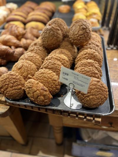 店内は本店と同様色々なパンがあるが、有名なそぼろパン(ティキンソボロ)は必食。見た目はメロンパンを茶色くした感じだが、周りはバリバリ(ぱりぱりではない)、中はもっちり、カロリーが高そうだっが、何個も食べたくなる。1個1,000ウォンとこのパンだけは価格を据え置いている模様。またにらパン(プチュパン)はニラ玉とパンが不思議にあうのが不思議。