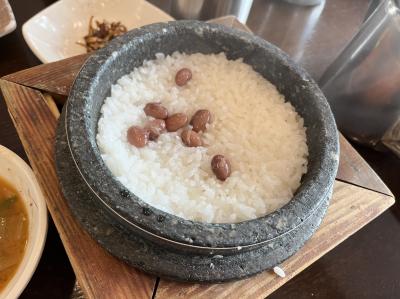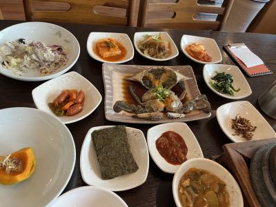 最初にオリーブとスライスアーモンドが入ったサラダと南瓜のあんかけがテーブルに。サラダはアーモンドの甘みとオリーブの苦みが胡麻ドレッシングとマッチ。その後7種類のおかず(牡蠣の塩辛が旨かった!)と一緒にカンジャンケジャンが到着。ご飯は釜の中にお豆と一緒に入っている(美味しいのだが、くっついてしまうのが欠点)。