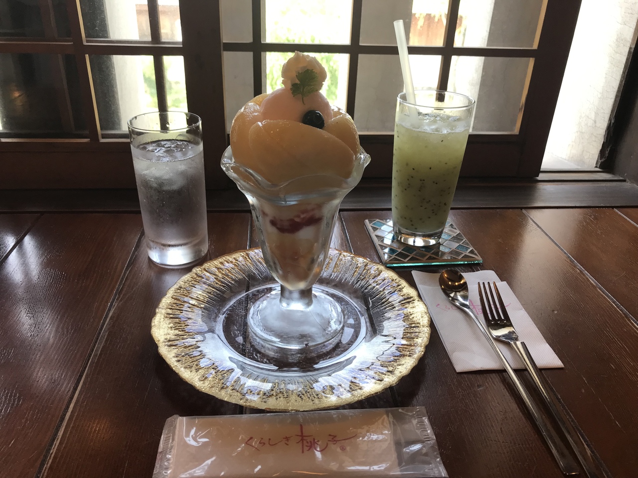 シャインマスカットのパフェと迷ったが、ジーンズ中の桃パフェを注文(先払い。現金のみ)。注文後2階のカウンター席へ。美観地区を眺めながらパフェを食べるのはなんとも言えない。