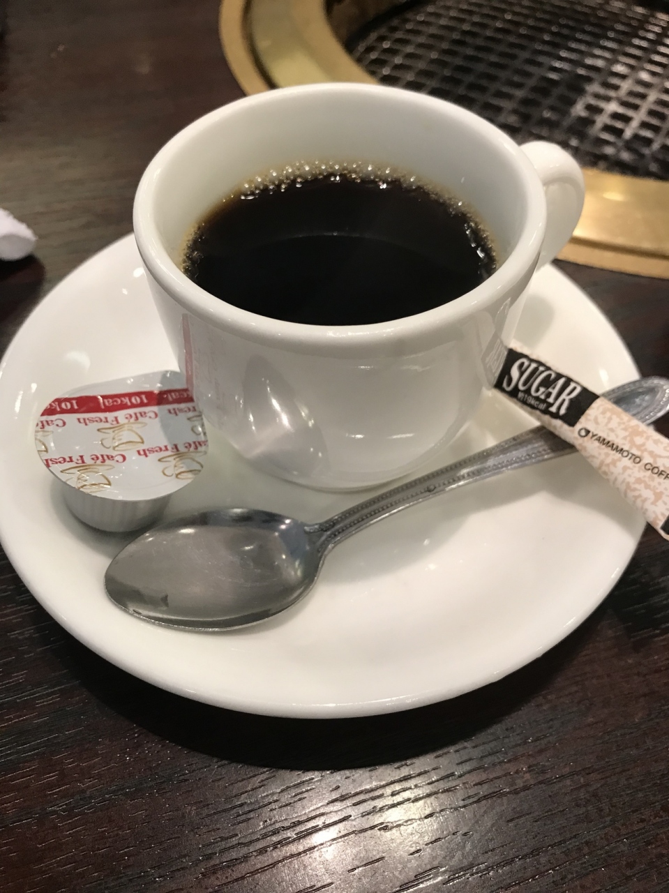 ランチタイムに入店。14時まではランチセットがあって、定番の焼肉定食を注文。お肉6切れ(バラ肉他)とキムチ、スープの他にナムル、大根、牛すじ入りの煮込み、最後にホットコーヒーが付いて1,100円。大阪のランチとしては少し高めかな(笑)。