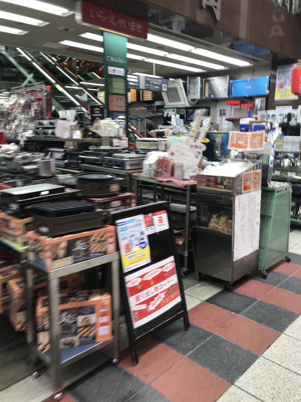 たこ焼きやお好み焼き関連の道具、機械を店頭に並べている店が多く、大阪らしさも。東京ではなかなか見つけられない道具も多い。- 旅行時期