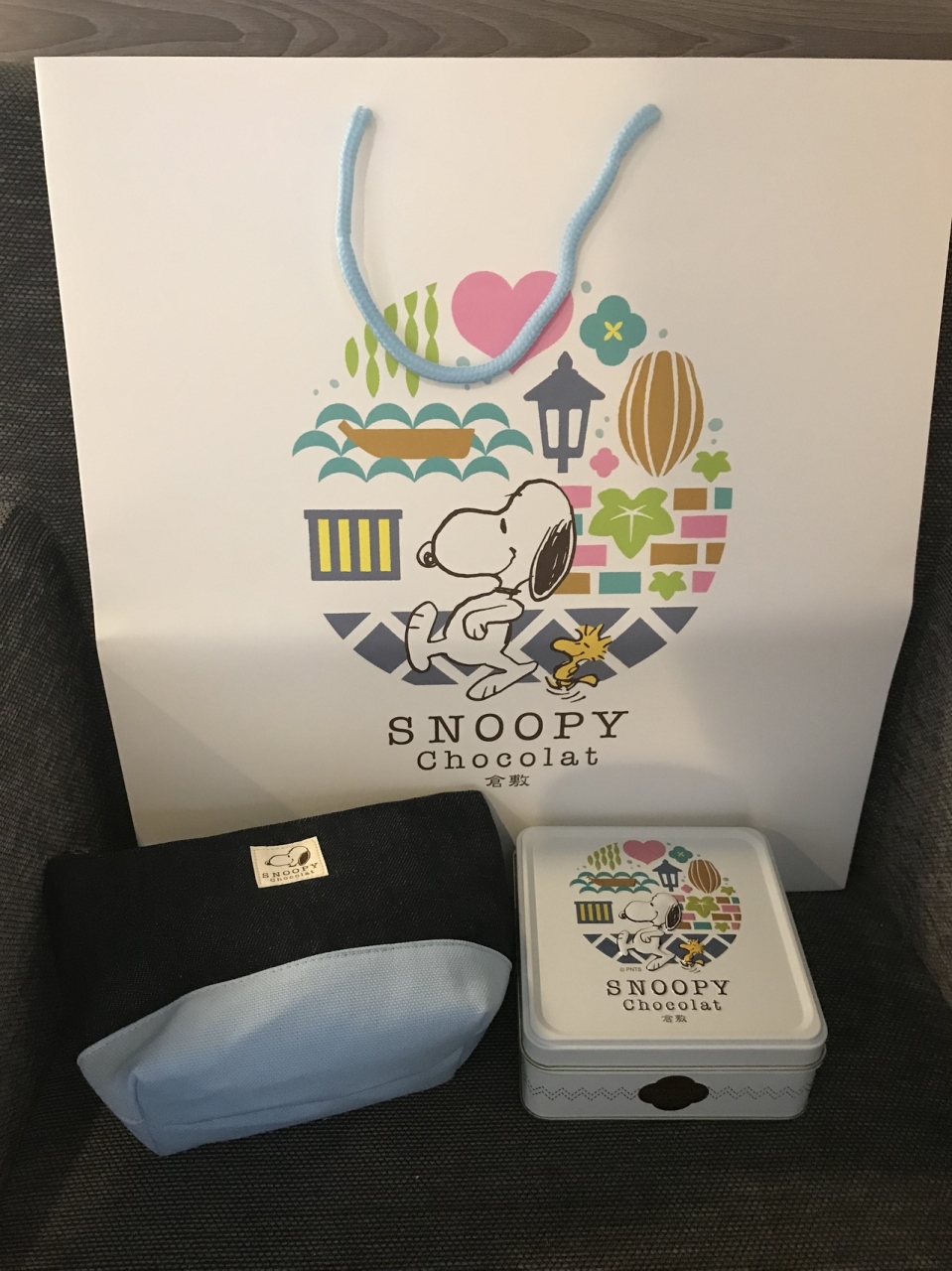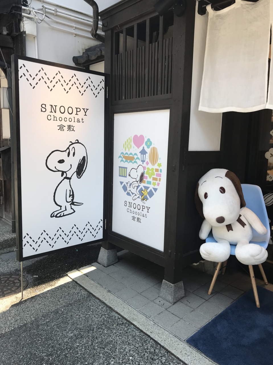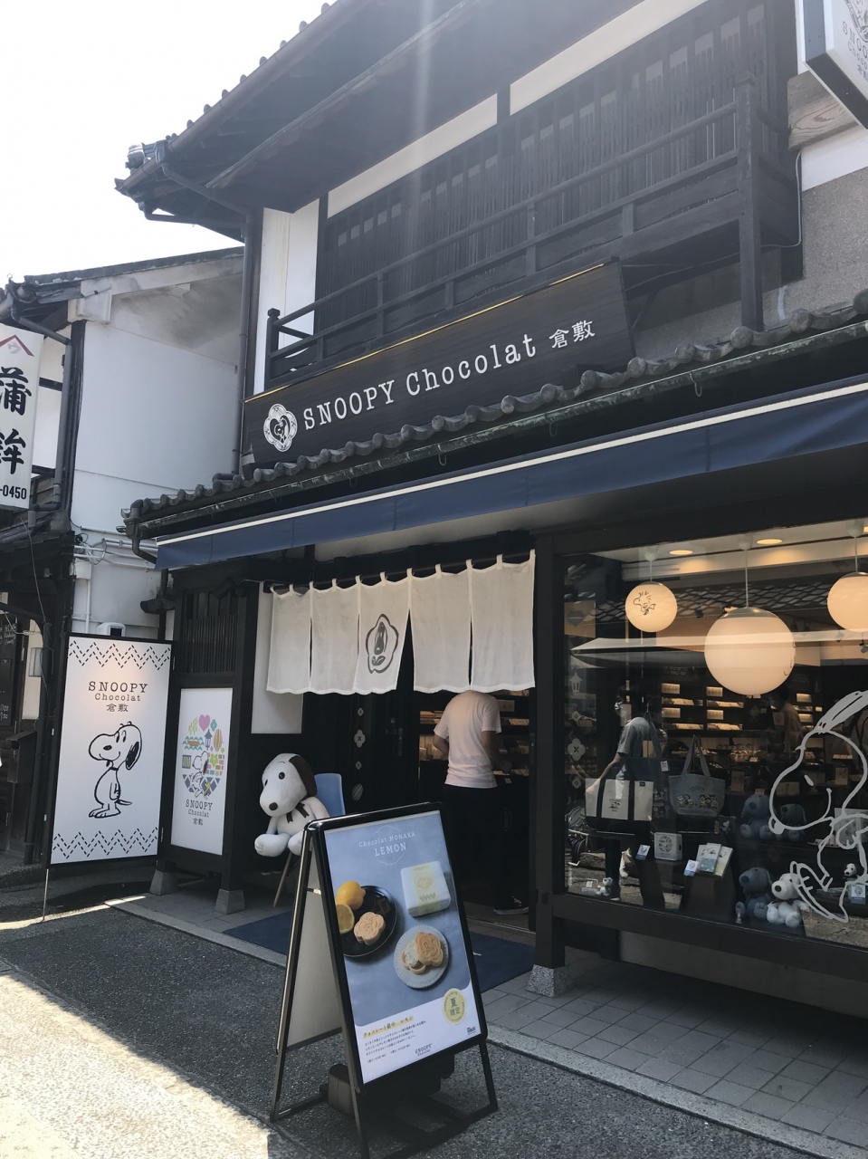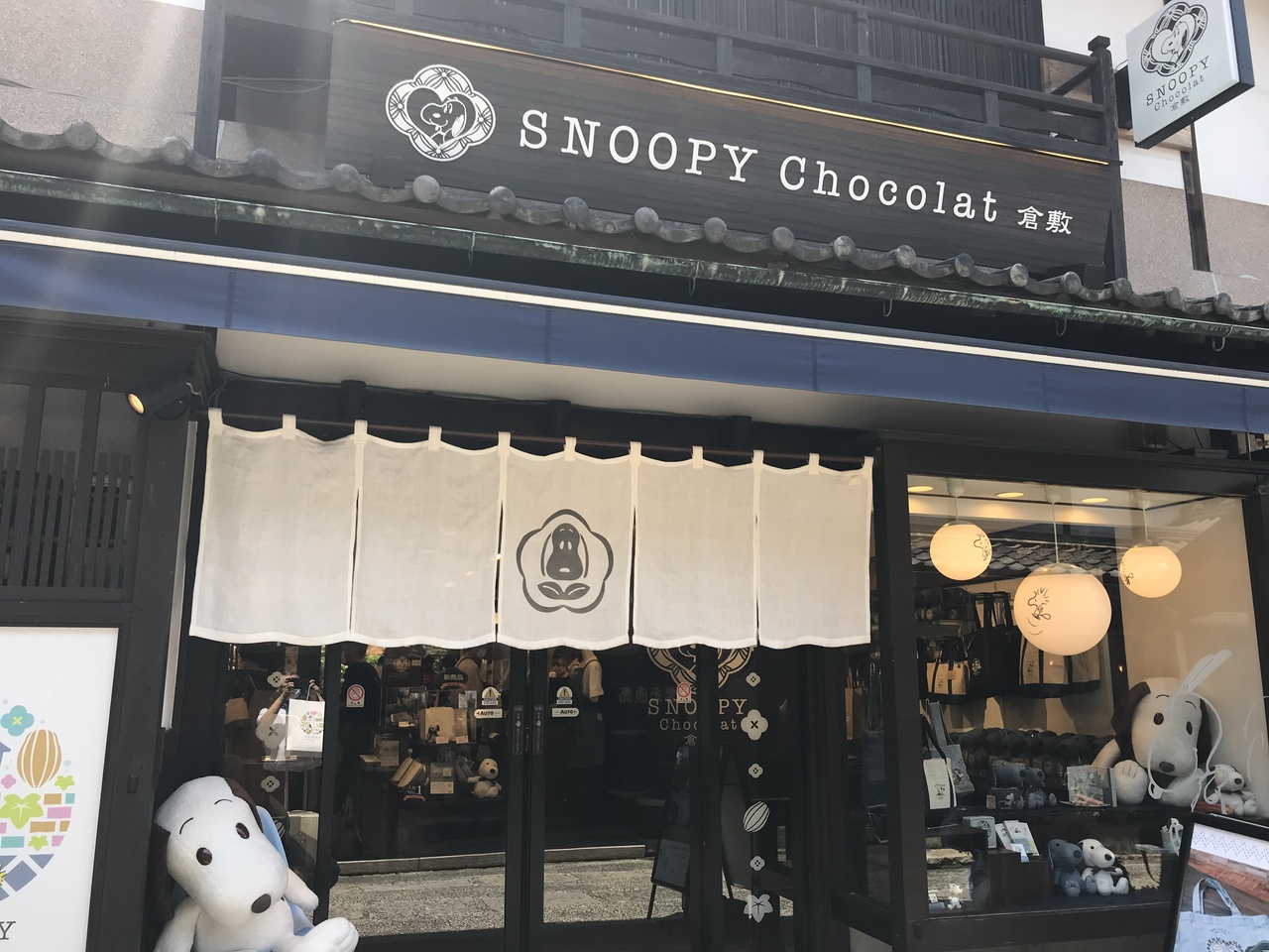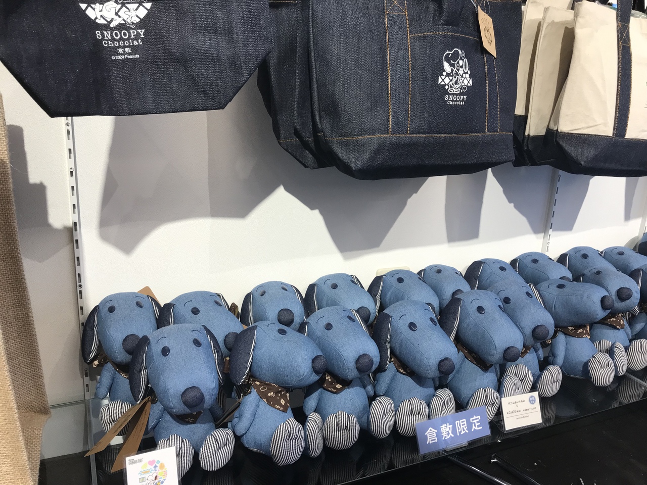 日本で3店舗(京都清水坂、京都嵐山、倉敷)しかないチョコレートブランド店だが、チョコレート以外の雑貨も充実。倉敷なので、ジーンズで作られたスヌーピーのぬいぐるみやバッグ、ポーチなどがあり、いろいろ買いたくなってしまう。