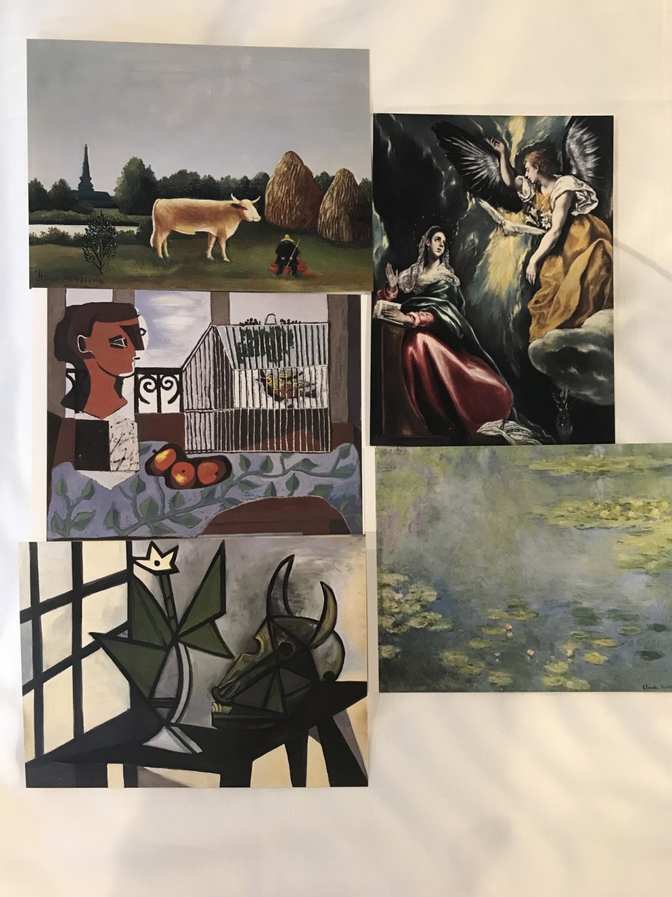 美術館でクロード・モネの「睡蓮」、パブロ・ピカソ「頭蓋骨のある静物」「鳥籠」に感動してしまい、それらのポストカードを購入。簡易的な額(紙でできている)も販売しているので、ちょっとしたお土産にも使える。- 旅行時期