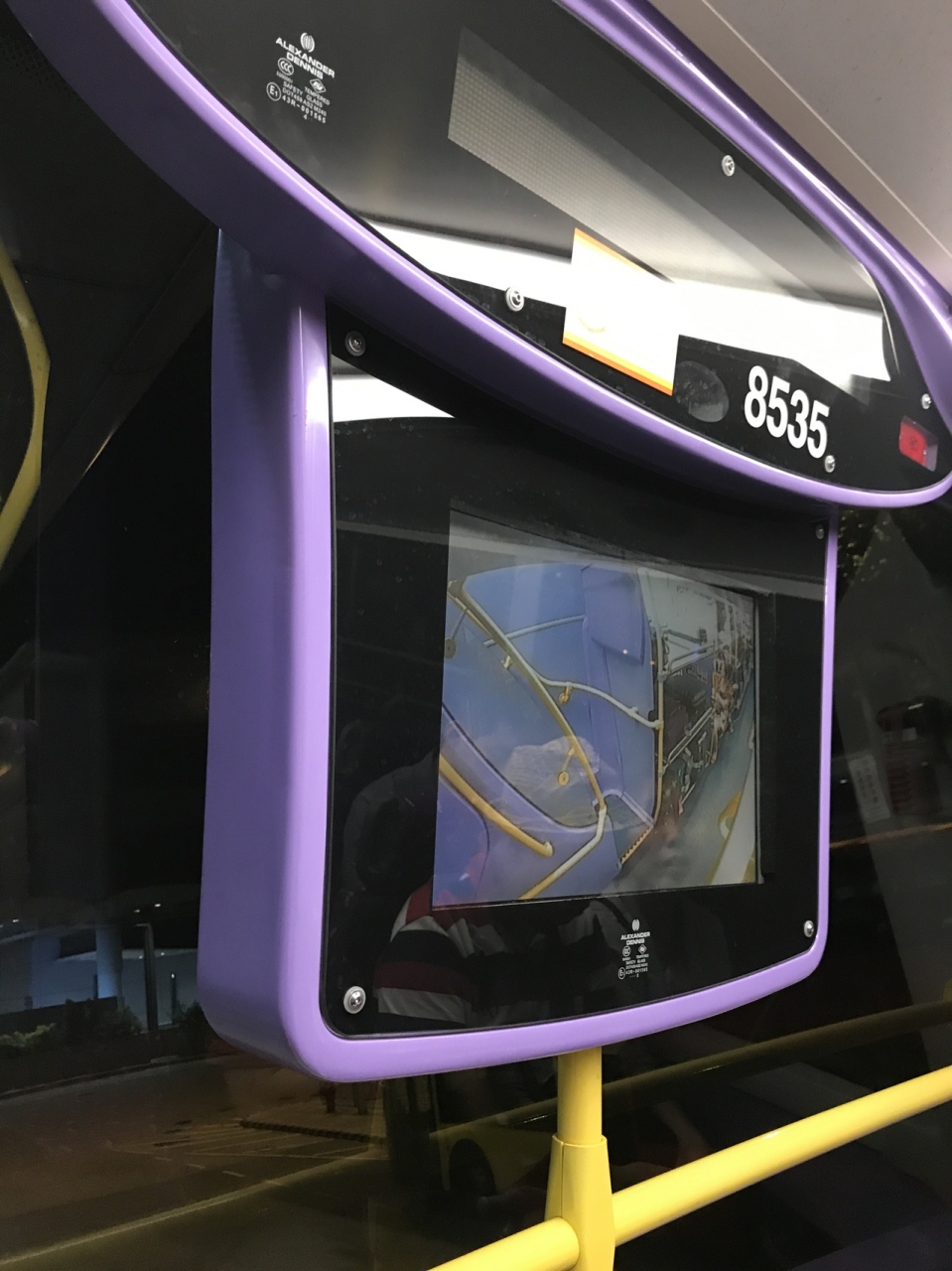 車両は香港名物ダブルデッカー。2階に乗車の場合でも大きい荷物(スーツケース等)は1階の荷物置き場に置くことになるのだが、荷物の状況が随時車内設置のモニターで写されるので、まあ安心かな。