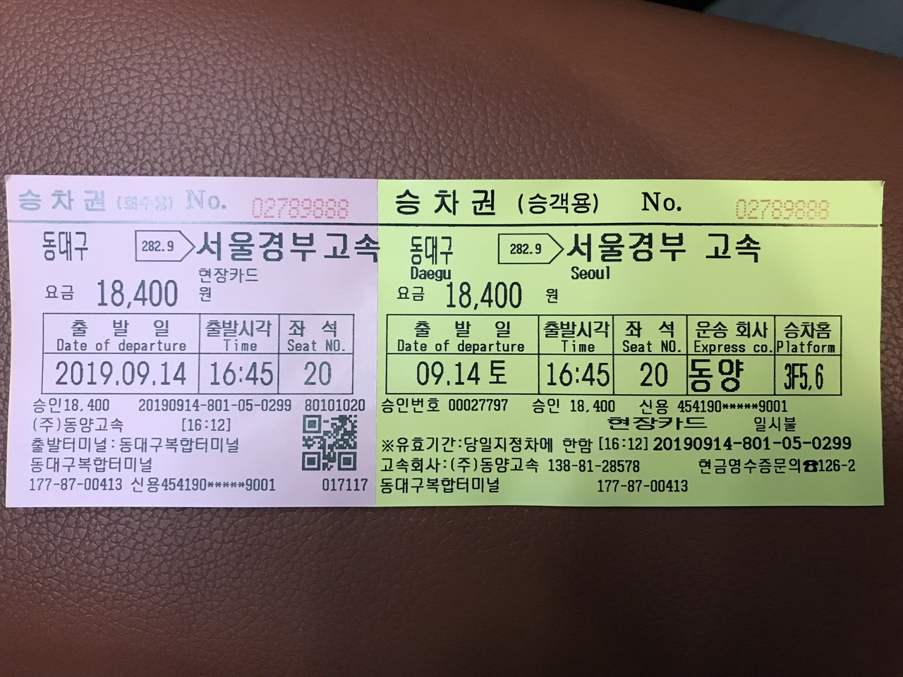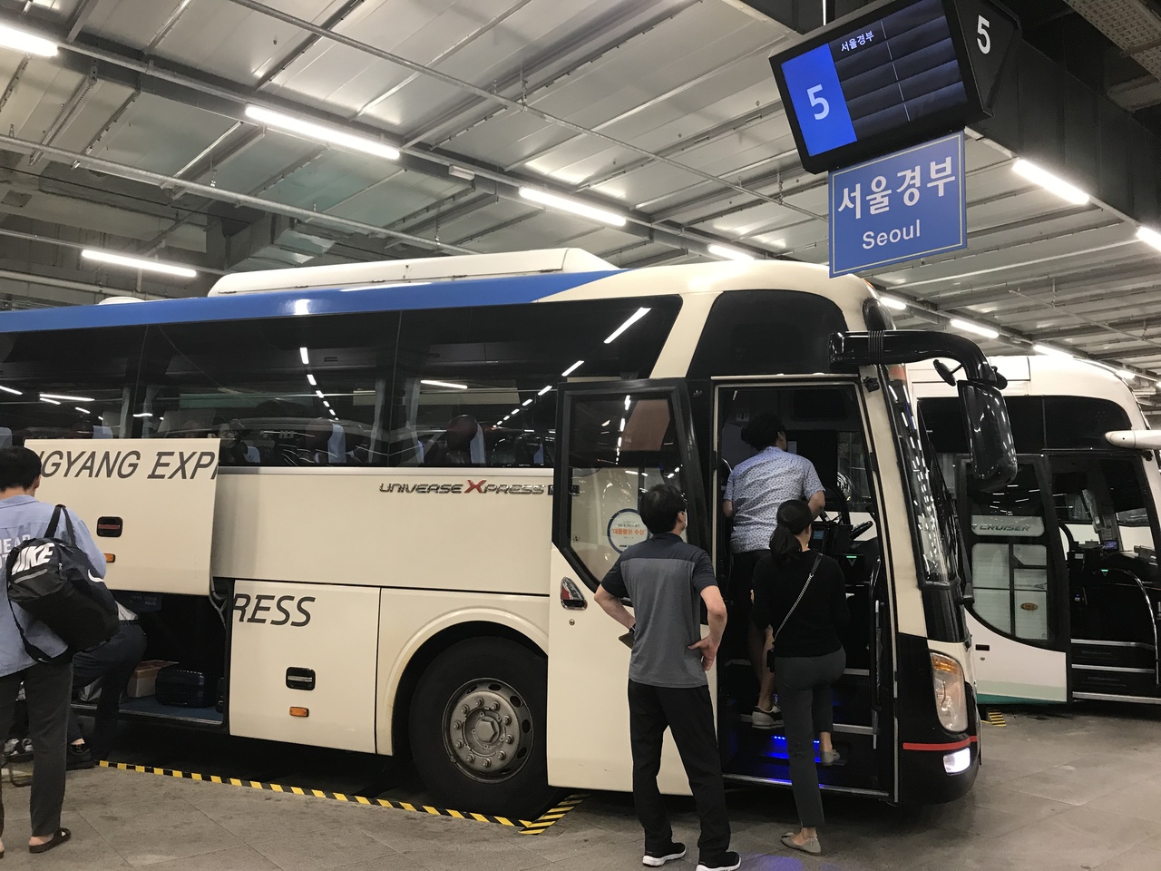 バスターミナルは5階建て、3階と4階がバス乗り場だが、乗車券売り場は3階にある。コンビニや飲食店も多く使い勝手が良い。乗車券用の自動券売機も多くあるが、クレジットカード専用(韓国以外発行のクレジットカードの場合、多少使いづらいかも)。一部の案内は表示には日本語もあるが、乗車券には出発時間、出発階・乗り場が数字で書いてあるのでわかりやすい(今回はソウル行きを利用)。- 旅行時期