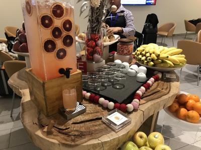 また、中央にバーカウンターがあって、その場でカクテルを作ってくれる。ビール、ウイスキーの種類も多く、ついつい飲んでしまうので、搭乗前に酔っぱらってしまうかも(笑)。- 旅行時期