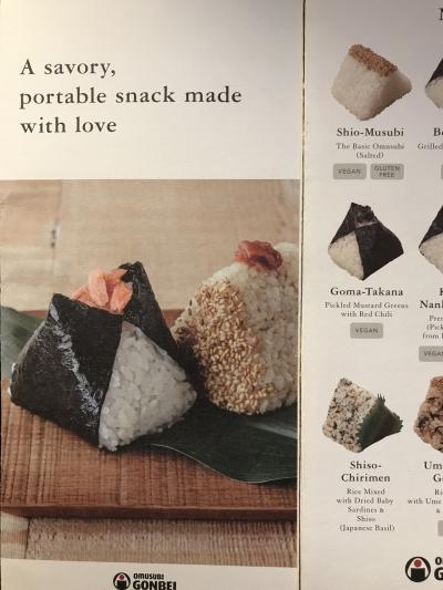 梅、鮭、たらこ等の定番に加えて高菜(Takana)、蛸飯し(Taco)等アメリカではなかなか食べられない具材もあって、日本食が恋しくなった際にお勧め。それと日本の権兵衛と同様に玄米使用(Brownと表記)のおにぎりがあるのも嬉しい。