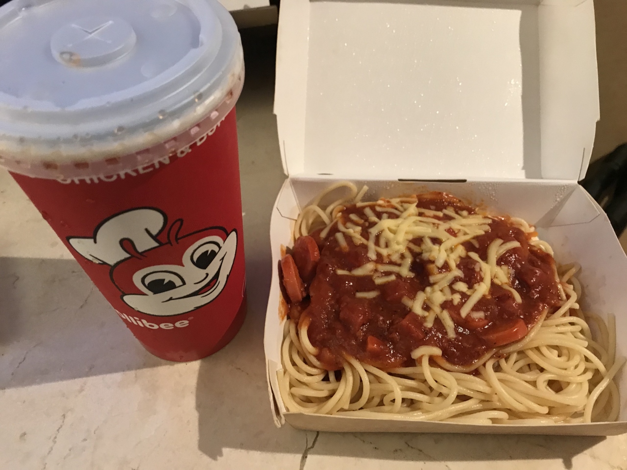 メニューはバーガー、チキン類が中心ではあるが、フィリピンでも人気のスパゲッティもあり。せっかくなのでいただきましたが、バナナが入っているケチャップを使った(と思われる)ソースはアメリカでも健在(少し甘め)。ちょっと茹で過ぎの感もあるがそれで良いのかも。