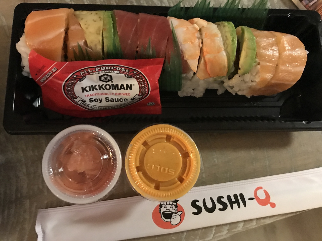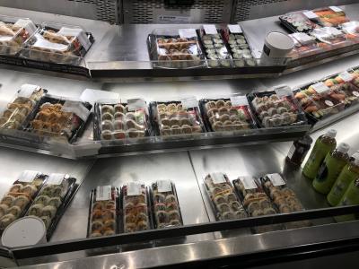 19時を過ぎると閉店セールをするようで、30%引き。アメリカやカナダではお馴染みのドラゴンロールをテイクアウト。サーモン、まぐろ、エビ、アボカドが綺麗に巻いてあって見た目は良い。味が若干淡泊なのでスパイシーマヨネーズ(別売り)を付けると味に変化があって美味しかった。- 旅行時期