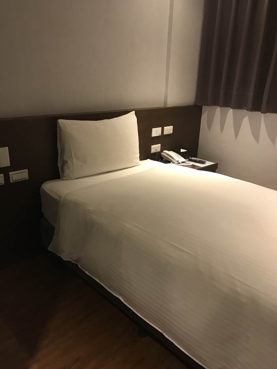 シングルルームに宿泊。床がフローリングで気持ちが良い。ベッドも悪くない。バスタブは無いが、シャワーの水量に問題なく、トイレも問題なし。