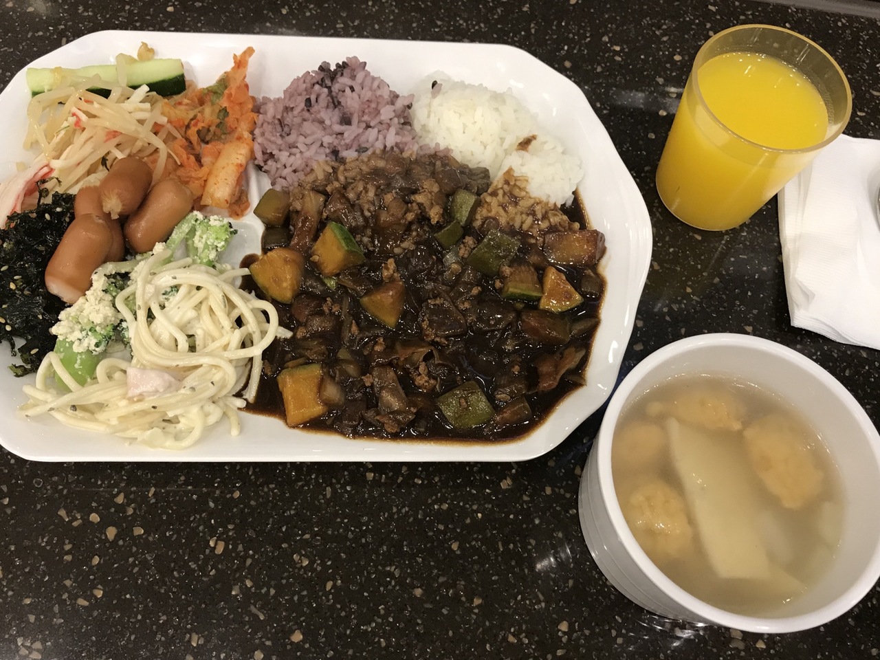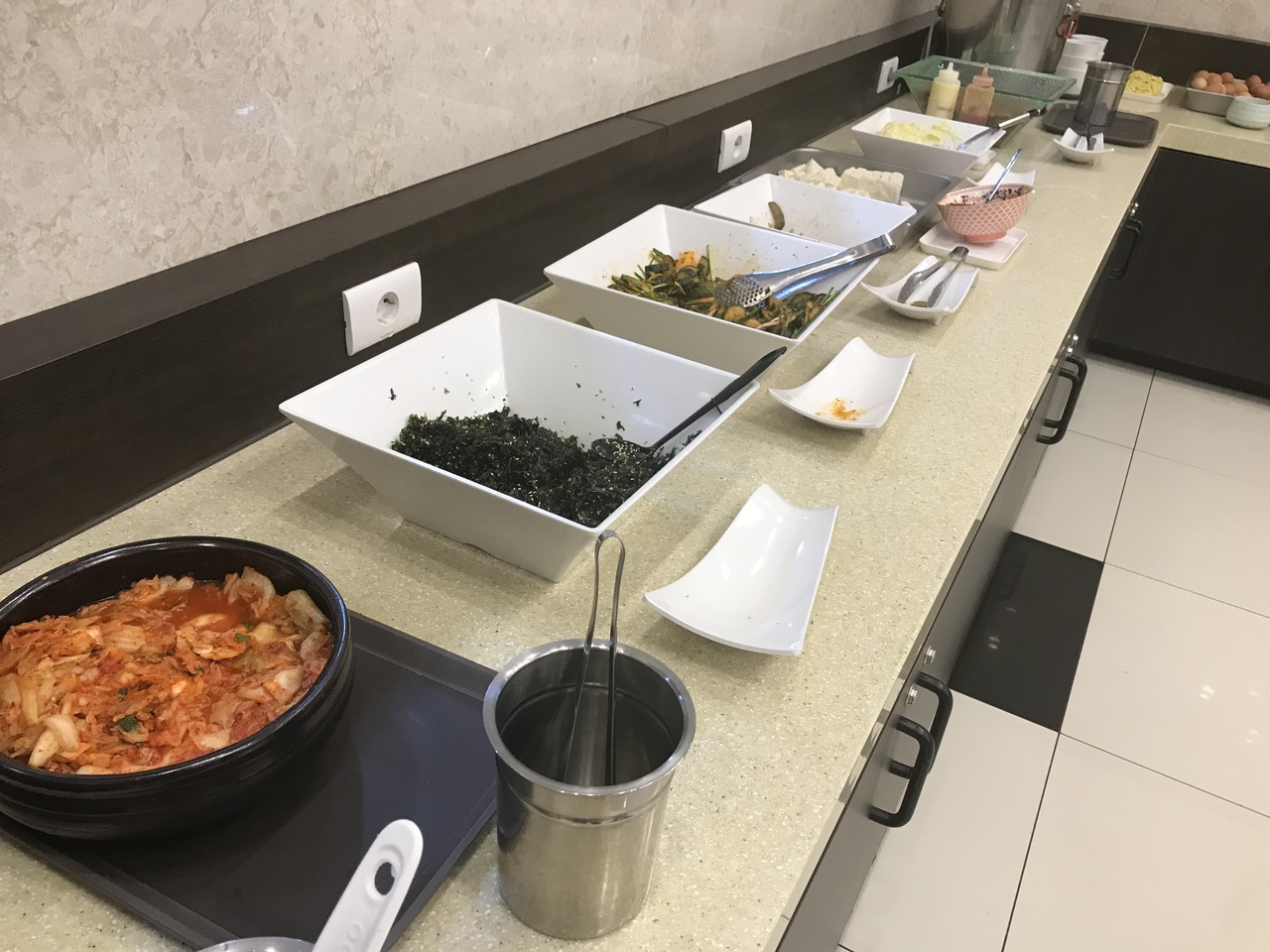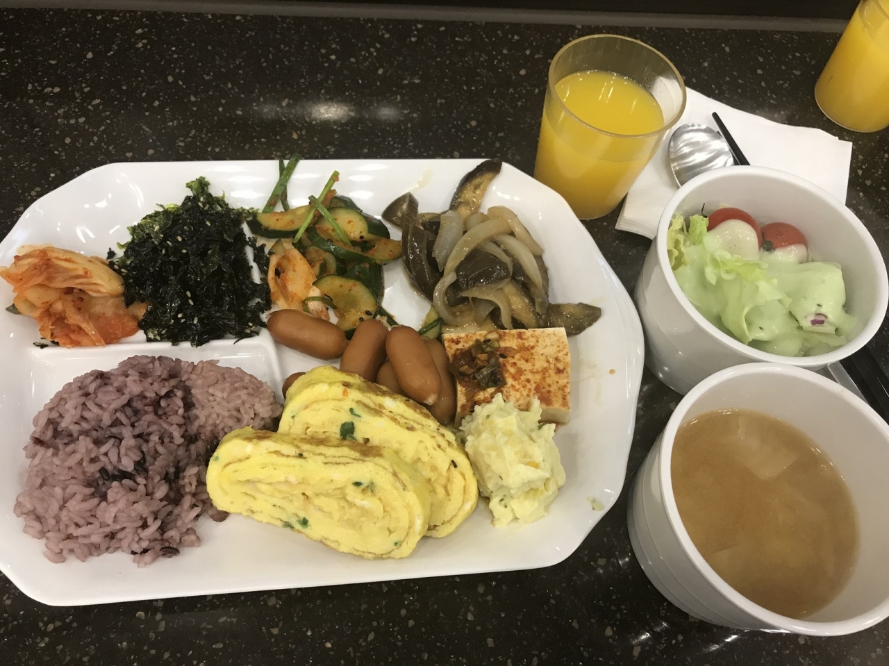 朝食もおかずの種類が多め。日替わりで韓国風のハヤシライスや卵焼きがあったりするのが嬉しい。