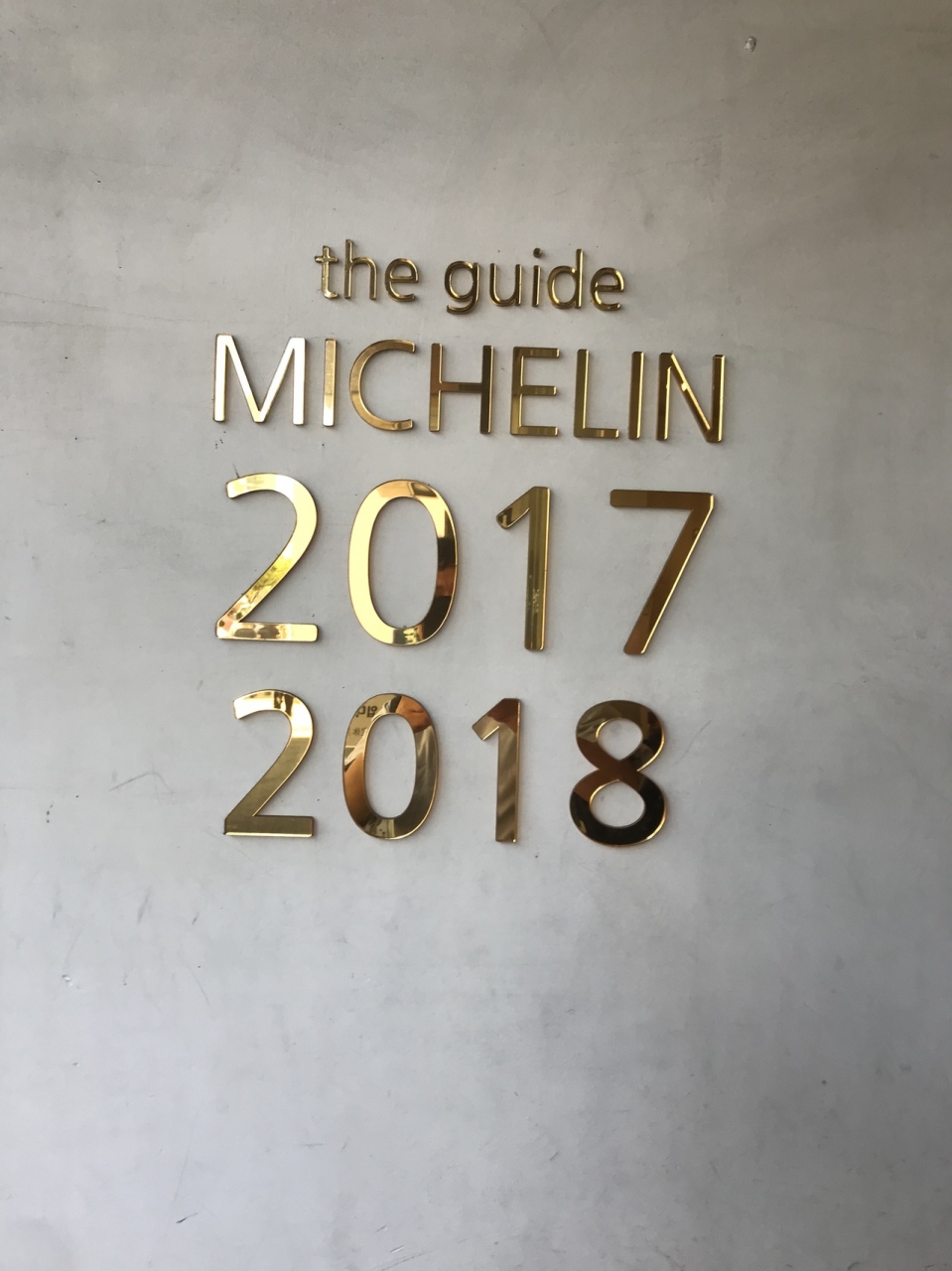 お店の外観、店内は明るい感じ。日本語で「コッチ」と書いてもある。そこまでは韓国の一般的な飲食店と変わらないが、ミシュラン2017、2018に選ばれた店なので、店頭には選定マークが!