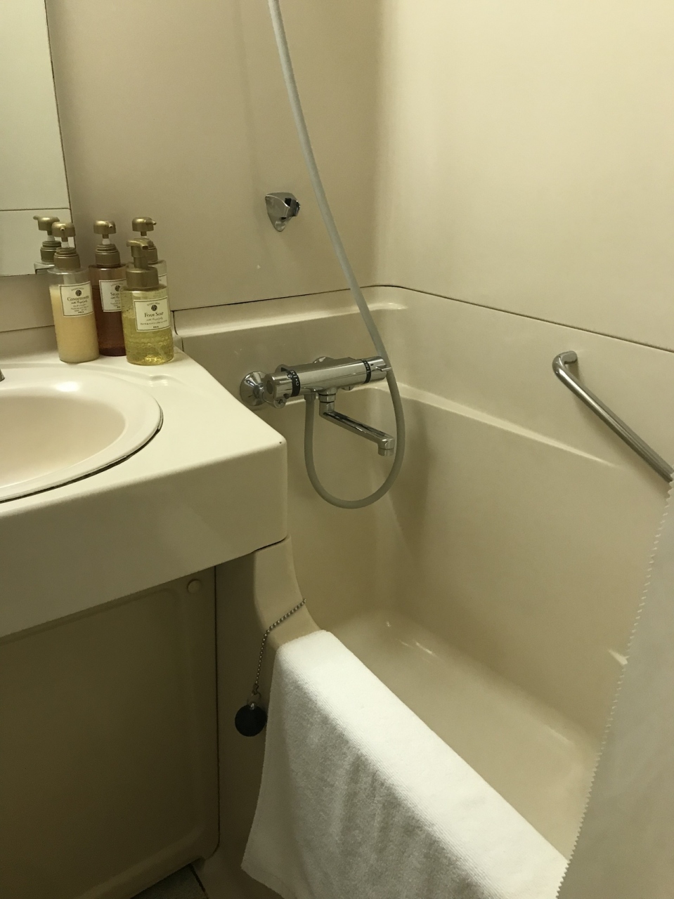 バスルームにバスタブが無いが、シャワーの水量は強力で問題無し。石鹸類は小さめの四角い容器に入っている。トイレも清潔で流れも普通。