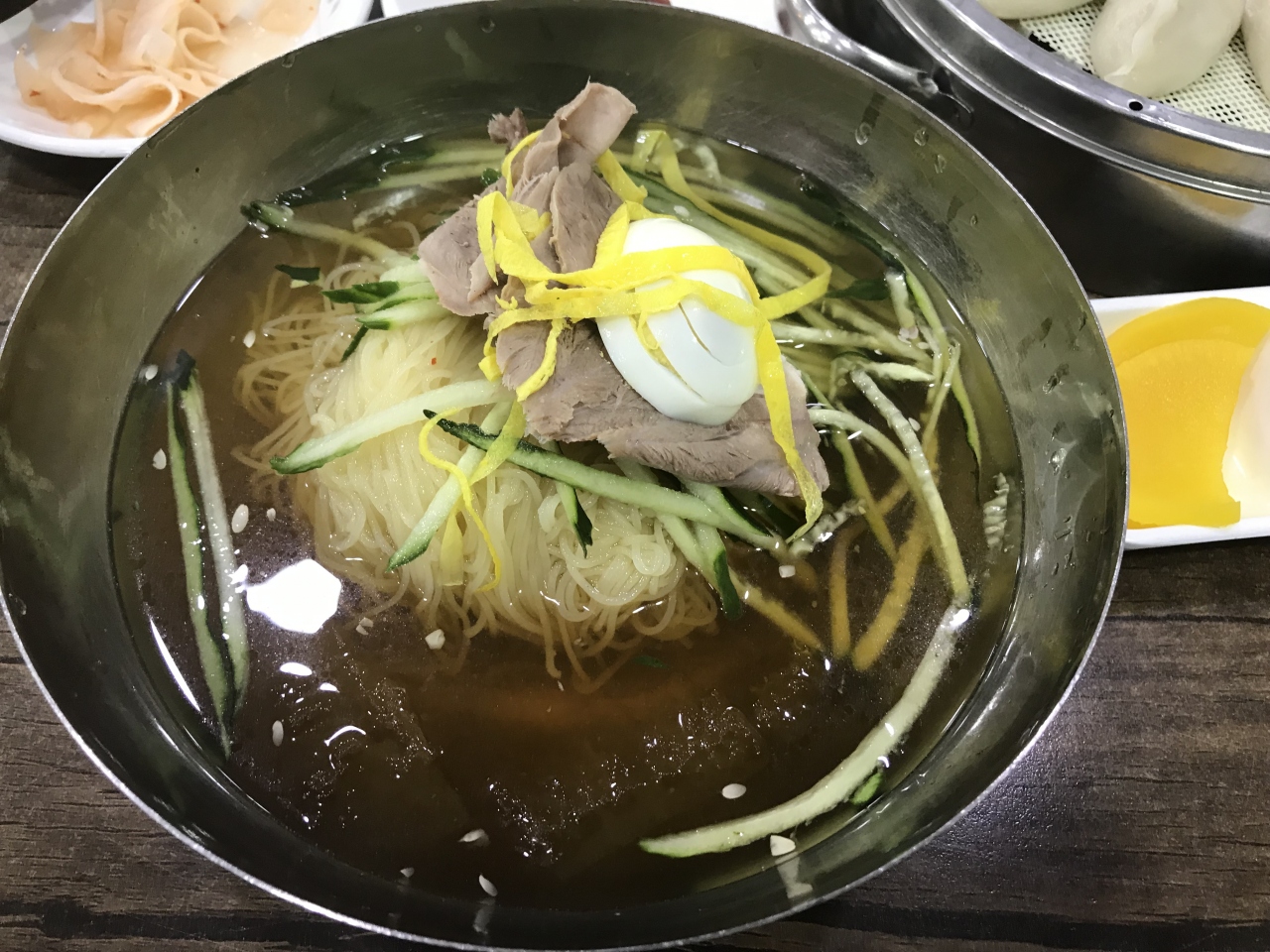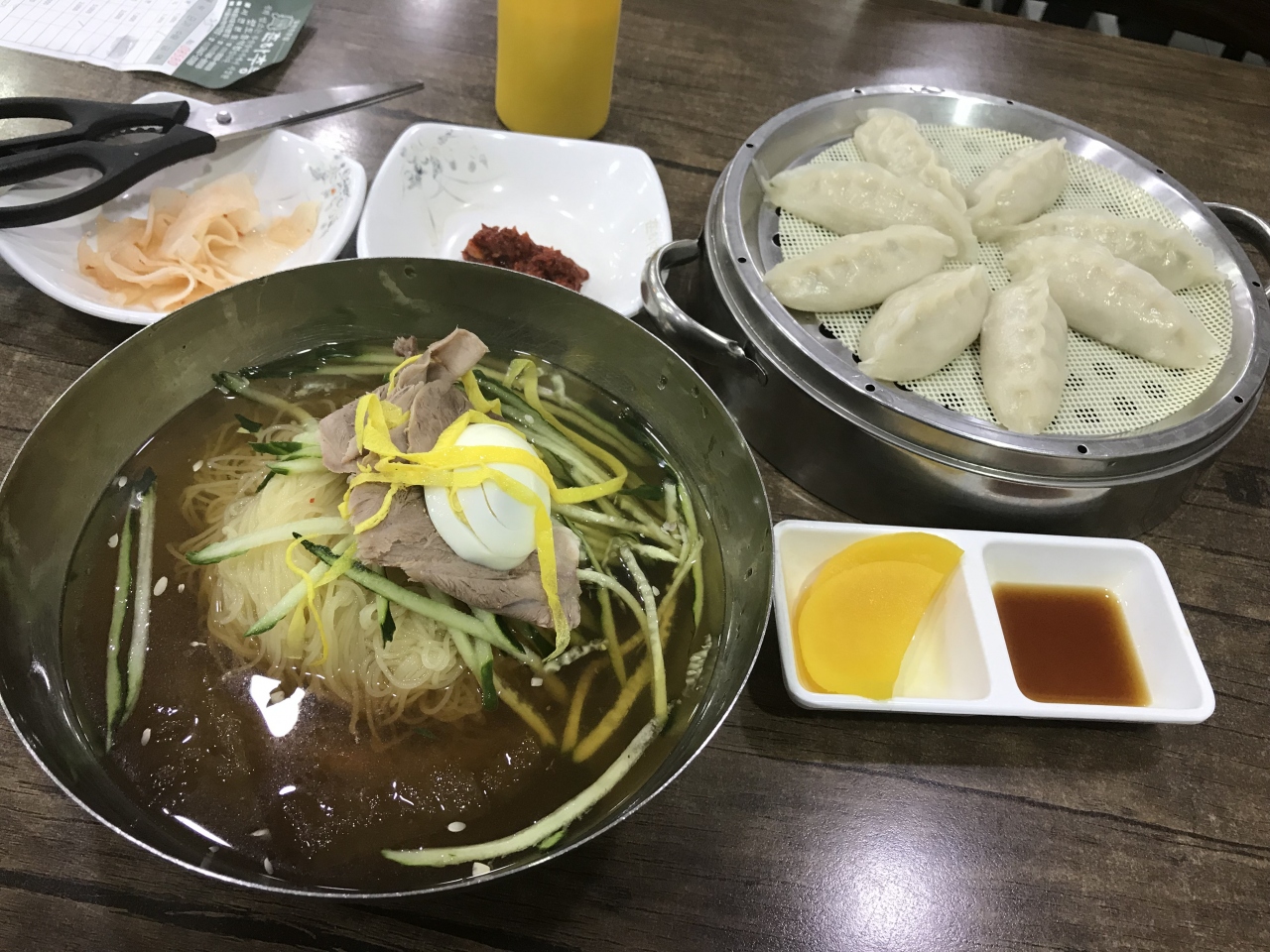 ミルミョン(冷麺)とマンドゥ(餃子)を注文。ミルミョンは観光客への配慮なのか、タテギ(唐辛子調味料)を別皿にしてくれたので、まずは冷たい牛肉スープをいただいて、その後好みの量を少しずつ入れて食べることが出来た。スープは冷たく非常に飲みやすい。マンドゥもちょうど良いサイズ。ニラが適量で非常に食べやすく美味しい。- 旅行時期