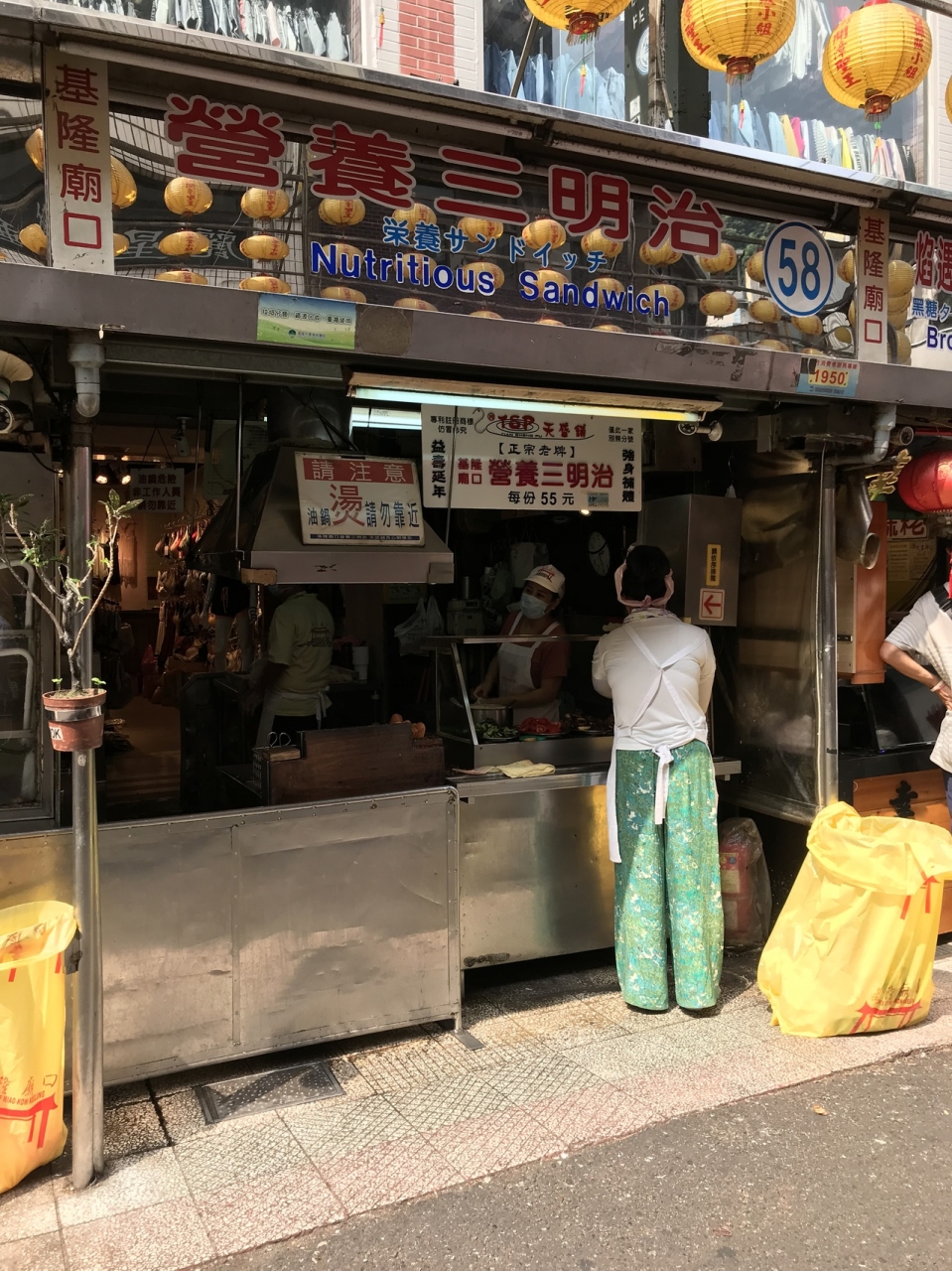 基隆廟口夜市(基隆夜市)内にある三明治(サンドイッチ)店。お店の番号は58番なので、番号を確認しながら行くと良い。夜市の店だが昼でも開いている。