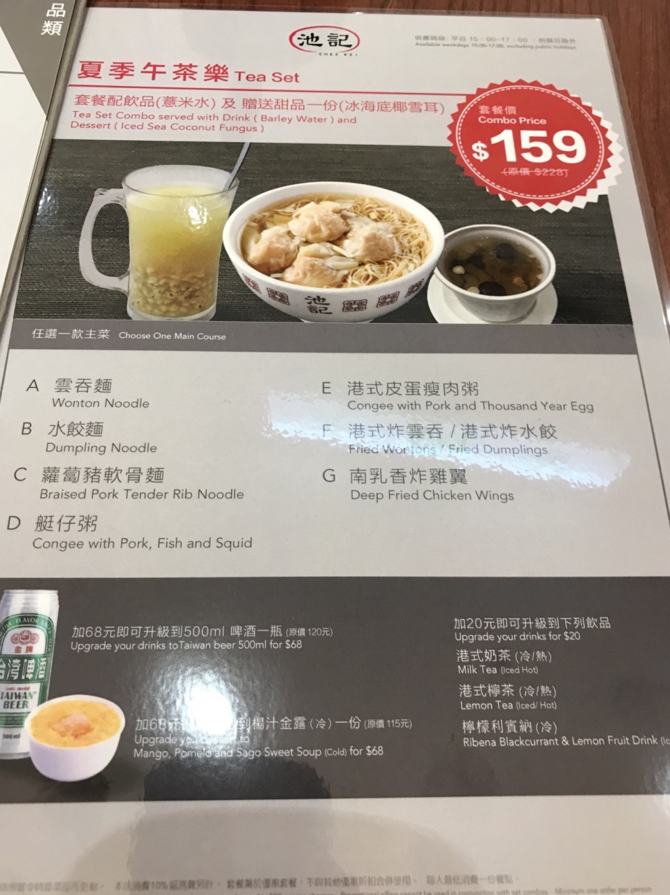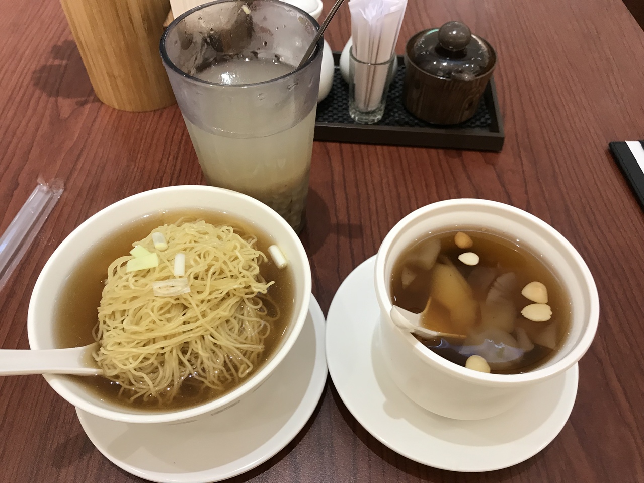 平日の15時から17時はワンタン麺やお粥と海底椰(デザート)、米水のセットがお得。