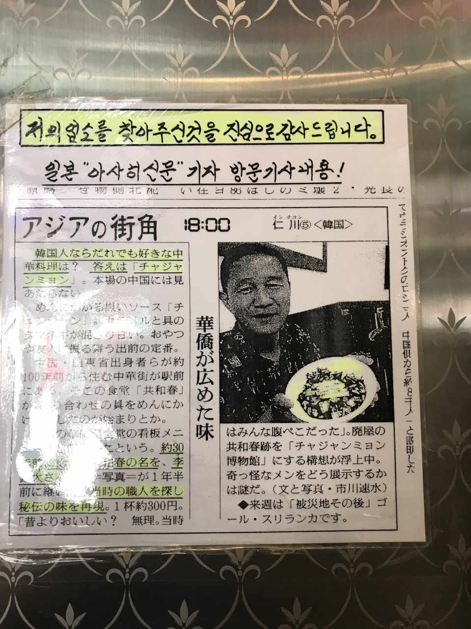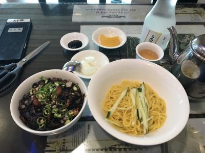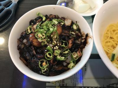 麺と具材は別々の丼に入っており、自分で混ぜる。共和春チャジャンミョンには海老、いか、厚揚げ、玉ねぎ、じゃがいもが入っており、普段食べるチャジャンミョンと全然異なる。薄く切った青唐辛子がピリッとしていてアクセントになっている。また、麺は太麺でモチモチしていて、具材との相性が良い(ハサミが用意されているので、本当はある程度切った方が良いかも)。一見麺は少なめに見えるが、結構なボリューム。お腹いっぱいになりました。