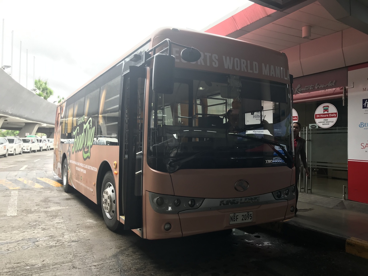 空港の各ターミナルの到着ロビーを出てすぐのところに、リゾーツ・ワールド・マニラの待合室があって、そこから1時間に1本無料送迎バスが運行されている。ただし、第1ターミナルからは約30分、第2ターミナルからは15分程度かかるので、特に帰国の際は注意が必要。
