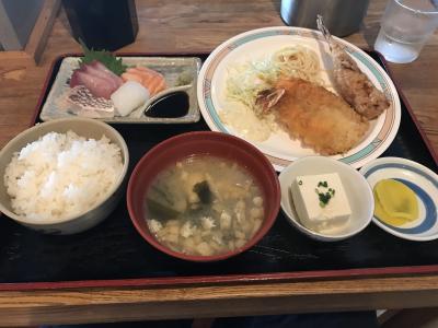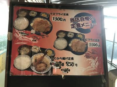 迷った結果、大エビフライ、ふぐ唐揚げ、刺身がセットになったよし定食を注文。ふぐ唐揚げは味が付いた衣のサクサク感が楽しめる。エビフライはたっぷりの自家製タルタルソースも美味しい。