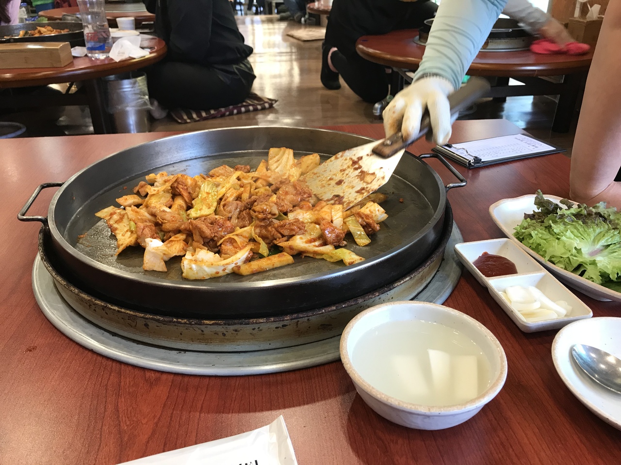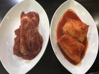 すぐにダッカルビの具材(鶏肉、キャベツ、青ネギ、さつまいも、トッポッキ)、レタス、大根の水キムチなどが運ばれてくる。ダッカルビはスタッフが炒めてくれて、出来上がりになると教えてくれる。