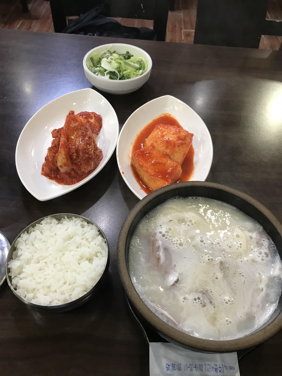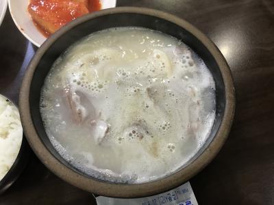 ソルロンタンを注文。まずキムチとカクテキが運ばれてくる。どちらも大きいままなので、セルフではさみで切って食べる。キムチは見た目は辛そうだが、すりおろした梨が入っているようで、さわやかな甘さがあって食べやすい。思わずお代わりしてしまった。