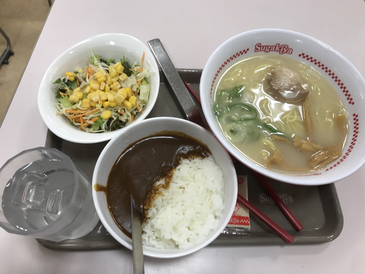基本のラーメンにスガキヤカレー・サラダセットを追加。ラーメンは他では味わえないあっさり味。スガキヤカレーはラーメンと一緒に食べることを前提にしているそうで、ルーは強過ぎない程度にスパイスの香りがある(具は溶けている)- 旅行時期